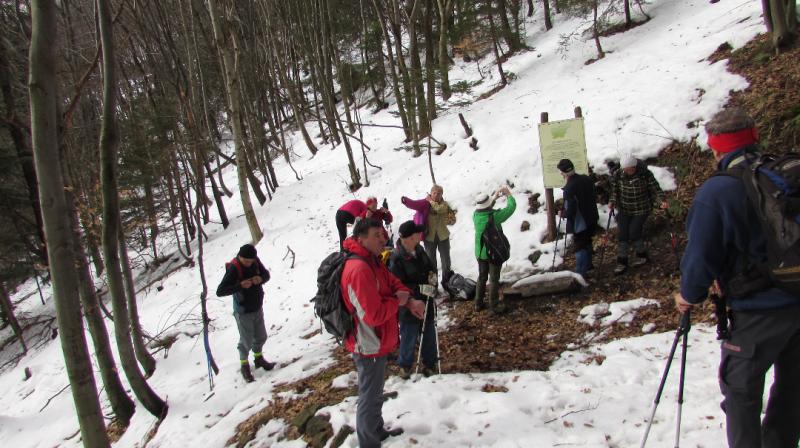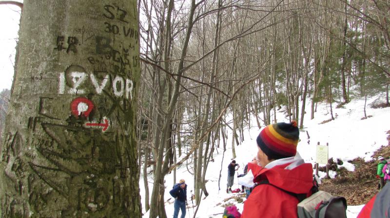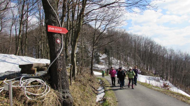 Po avtocesti smo se peljali vse do odcepa za Šentjur pri Celju in nadaljevali v smeri Rogaška Slatina, Rogatec. V naselju Dobovec smo zapustili avtobus in pričeli naš pohod. Pot nas je vodila mimo Lovskega doma Lipovec ob reki Sotli. Naš pohod se je nadaljeval po široki gozdni cesti, ki se je vzpenjala po gozdnatih pobočjih Maceljskega hribovja. Po eni uri vzpona smo prispeli do križišča, tik pod najvišjim vrhom Veliki Belinovec (717 m), ki je zelo poraščen in razgleden. Nato smo sestopili po ozki gozdni stezi do izvira čudovite reke Sotle (640 m). Ob tem je bilo treba prestopiti na hrvaško stran državne meje, ker je na drugi strani varnejši pristop. Izvir je urejen v obliki malega vodnjaka, ob njem stoji informativna tabla, ki jo je postavil Zavod za gozdove Slovenije.