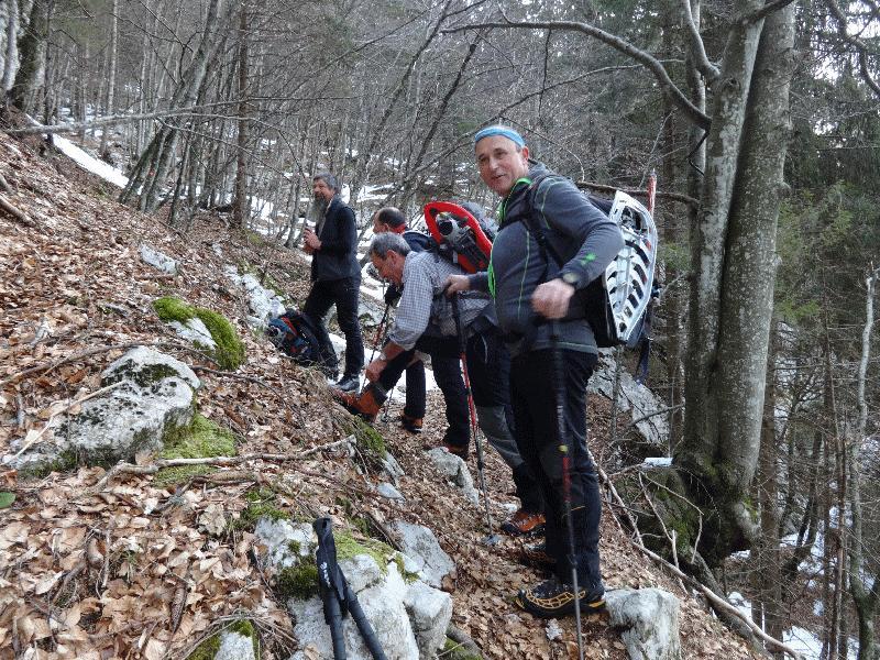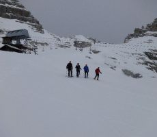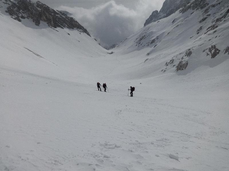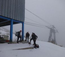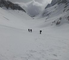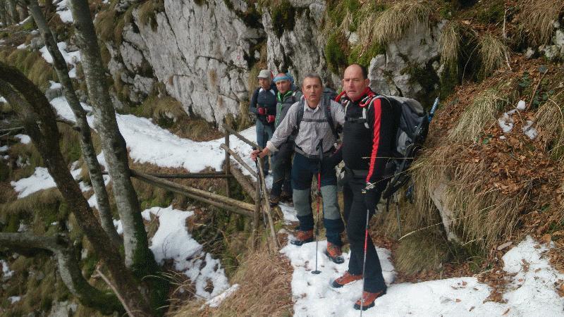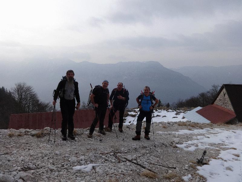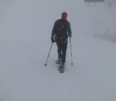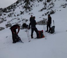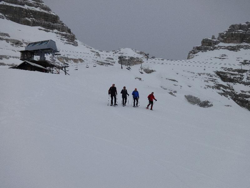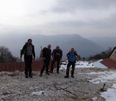 Startali smo v oblačnem vremenu in se povzpeli po markirani poti do planine Krnica. Tu kratka pavza za prigrizek in ogled snežnih razmer. Po dolini Krnice nas je počasi ulovila megla in pod sedlom je bila vidljivost zelo slaba, vendar je vmes celo prebilo somce. Na sedlu se srečamo s tremi Bovčani, kjer malo predebatiramo in glede na informacije se že poraja misel , da bi se izognili pristopu na Prestreljenik zaradi varnosti. Ogledamo si še opustošenje na žičniški hišici.