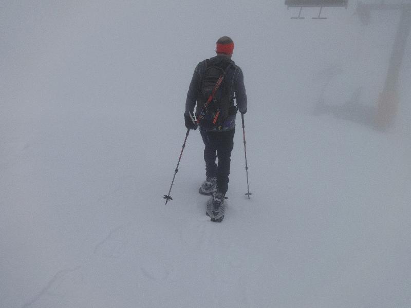 Povzpnemo se na Sedlo, kjer po daljši pavzi in glavni malici pade odločitev za sestop po smučišču. Kot je pokazala narava je bila to modra odločitev, saj nas je pod Postajo D zajela megla, kjer je bila vidljivost le še okli 20m. Tu nam prideta nasproti dva deskarja in mi takoj izrabimo njivo sleda za sestop proti vmesni postaji nad B postajo, kjer šele pridemo iz megle in rahlega sneženja, Tu gremo po makadamski cesti, ki je večinoma zasnežena, določeni odcepi so pa kopni in grušč je obupen, Tako sestopa do našega avta in se zapeljemo v Bovec.