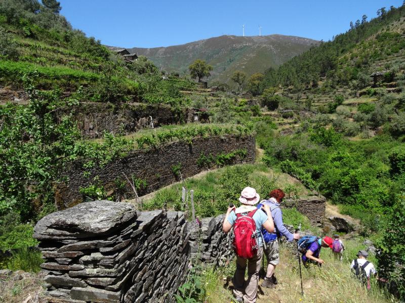 2.6., torek. Dan je bil namenjen celodnevnemu pohajkovanju po vinorodni dolini reke Douro, od koder prihaja grozdje za sloviti portovec. Privoščili smo si dolg pohod med kmetijami in vinogradi, malo gor, malo dol, vse do reke Douro, ki smo ga zaradi vročine nekoliko skrajšali. Obiskali smo Quinto de Marrocos, družinsko posestvo portovca, kjer smo ob prizgrizku pokusili nekaj vrst odličnih vin: 10 let staro rdeče vino Tavny, starano v lesenih sodih, belo vino Lagrima ter belo in rdeče Sequeirinha (več: http://www.quintademarrocos.com/ ). Nato smo se poslovili od doline reke Douro in se začeli vzpenjati na Visoko planoto Beira Alta. Ustavili smo se v mestecu Penedono, s slikovitim srednjeveškim gradom, kjer poleti prirejajo viteške igre. Sprehodili smo se do skrivnostnega prazgodovinskega dolmena, kakršnih je še veliko na tej planoti. V sončnem zahodu smo prispeli do vznožja Zvezdnih gora.