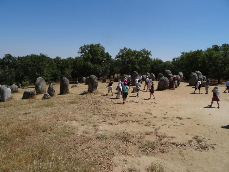 5.6. petek. Iz grobega granitnega višavja smo se spustili v rodovitne valovite ravnice pokrajine Alentejo (na drugi strani reke Tejo). Objela nas je mehkoba pokrajine in nepreglednost nasadov hrastov plutovcev. Potem nas je navdušila Evora (UNESCO), pravo zlitje vsega portugalskega. Tu v sožitju bivajo rimski, mavrski in srednjeveški ostanki skupaj z živahno sedanjostjo. Ogledali smo si bizarno frančiškansko kostnico, rimski tempelj in ostale znamenitosti mesta, z množico cerkva in palač. Še posebej je bilo zanimivo prosto raziskovanje mestnih uličic. Nato smo se zbrali pri mestni areni in se odpeljali do največjih megalitskih ostankov na Iberskem polotoku, menhirjev, ki so skriti med bujnimi plutovci. Tu je vsak po svoje lahko vsrkal energijo nekdanjih svetišč. Vožnjo smo nadaljevali vse do skrajnega juga Portugalske, v pokrajino Algarve, kjer smo se za dva dni ustavili v obmorskem mestu Faro. Zvečer smo si v lokalni restavraciji Centenario privoščili portugalsko večerjo, ob petju fada. Helena Silva je zapela nekaj ne preveč otožnih pesmi, sledilo ji je še nekaj lokalnih pevk in pevcev. Zanimivo srečanje z značilnim »saudade« petjem.