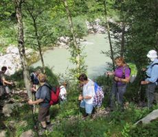 V Kobaridu, pri poslopju mlekarne in muzeja, zapustimo avtobus in pričnemo naš triurni pohod po Soški poti ob reki Soči. Hojo nadaljujemo po cesti, ki pelje v Drežnico, prečkamo Napoleonov most čez reko Sočo. Takoj za mostom se usmerimo na pot k slapu Kozjak in nadaljujemo ob levem bregu Soče. Vseskozi občudujemo, kako si bistra reka - hči planin, utira pot po dolini. Pri Otonah nam zastane dih ob pogledu na nevarne tolmune. Zanimiva in prijetna je steza ob reki, močno šumenje in bučanje rečnih valov, ki butajo ob skale in hitijo dalje po strugi. Reka Soča poje pesem in oddaja istočasno svojo glasbo tudi planincem, turistom in vsej živi naravi, od izvira do izliva v Jadransko morje. Opazujemo pogumne mladce in mladenke, ki v kajakih veslajo po reki in nevarnih tolmunih.