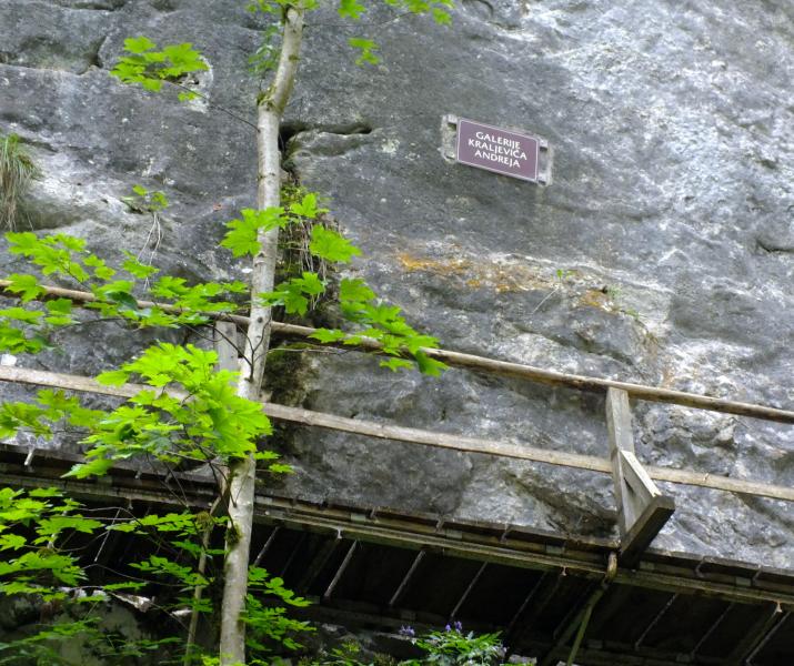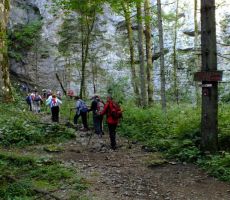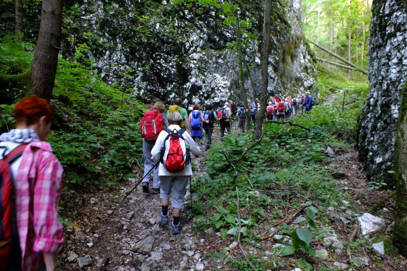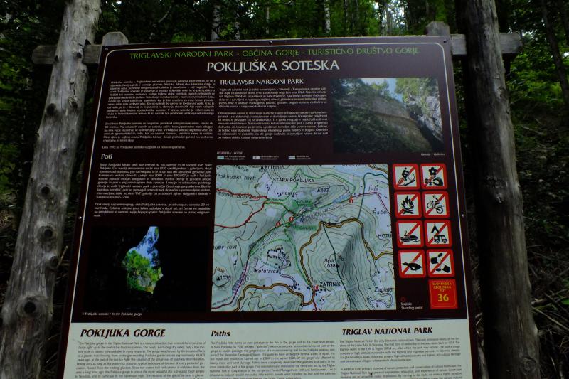 Že med samo potjo smo se večkrat zaustavili, da smo lahko prisluhnili Miru, ki nas je opozoril na glavno kamenino v soteski; to je sivi apnenec z gomolji roženca (kremena), ki naj bi bili odloženi v globljem zgornjetriasnem morju oziroma v tektonskem jarku med Julijsko in Dinarsko karbonatno platformo. Postali smo tudi zaradi botaničnih posebnosti, saj je območje Pokljuške soteske sestavljeno iz gozdne združbe: bukev, smrek, gorskega javorja, črnega gabra in malega jesena. Rastlinje soteske ima značilnosti alpskega območja; sem so jih zanesle ledeniške vode. Tu so se ohranile zaradi posebnih podnebnih razmer. Med njimi 3 vrste kamnokrečev, dvocvetna viola, predalpski peteroprstnik, pisana vilovina, alpski čober, Scheucerjeva zvončnica in več vrst praproti; med njimi predvsem peruša. Rastlinstvo na dnu soteske se loči od rastlinstva, ki uspeva višje na pobočjih, v skalnih razpokah in na policah. Med znamenitosti soteske sodi tudi Pokljuška luknja, skalna votlina z dvema vhodoma in tremi naravnimi okni, v kateri naj bi se med svojim begom v Nemčijo skrival Primož Trubar; skozi luknjo vodi pot naprej na Staro Pokljuko ter Stranska soteska, ki jo ob deževnih obdobjih napolnjuje 22 m visok slap. V osrednjem delu soteske so številni naravni mostovi, na najožjem, nekdaj neprehodnem delu soteske, pa so že leta 1930 speljali 800 metrov turistične poti (lesene mostove v partizanskem prehodu, imenovane Galerije kraljeviča Andreja). Na izhodišče smo se vračali po isti poti, saj bi bil prehod proti Zatrniku, zaradi podrtih dreves - verjetno posledica vetroloma, za našo 50-člansko skupino prezahtevna pot.
