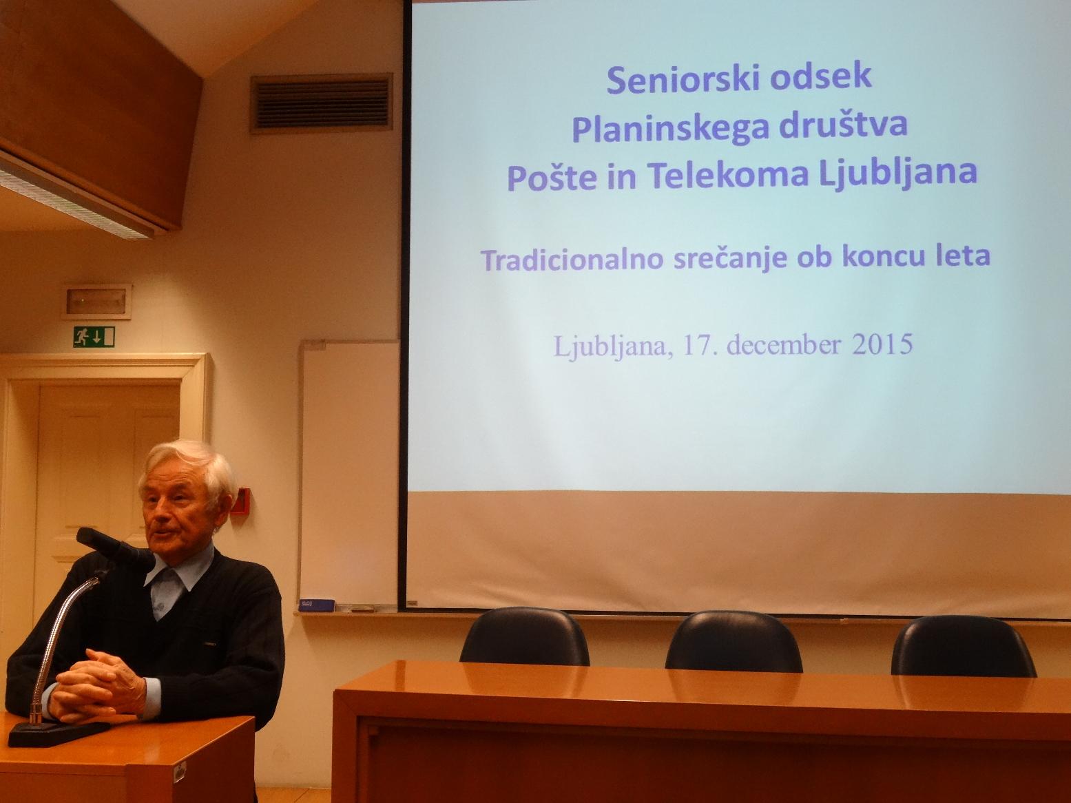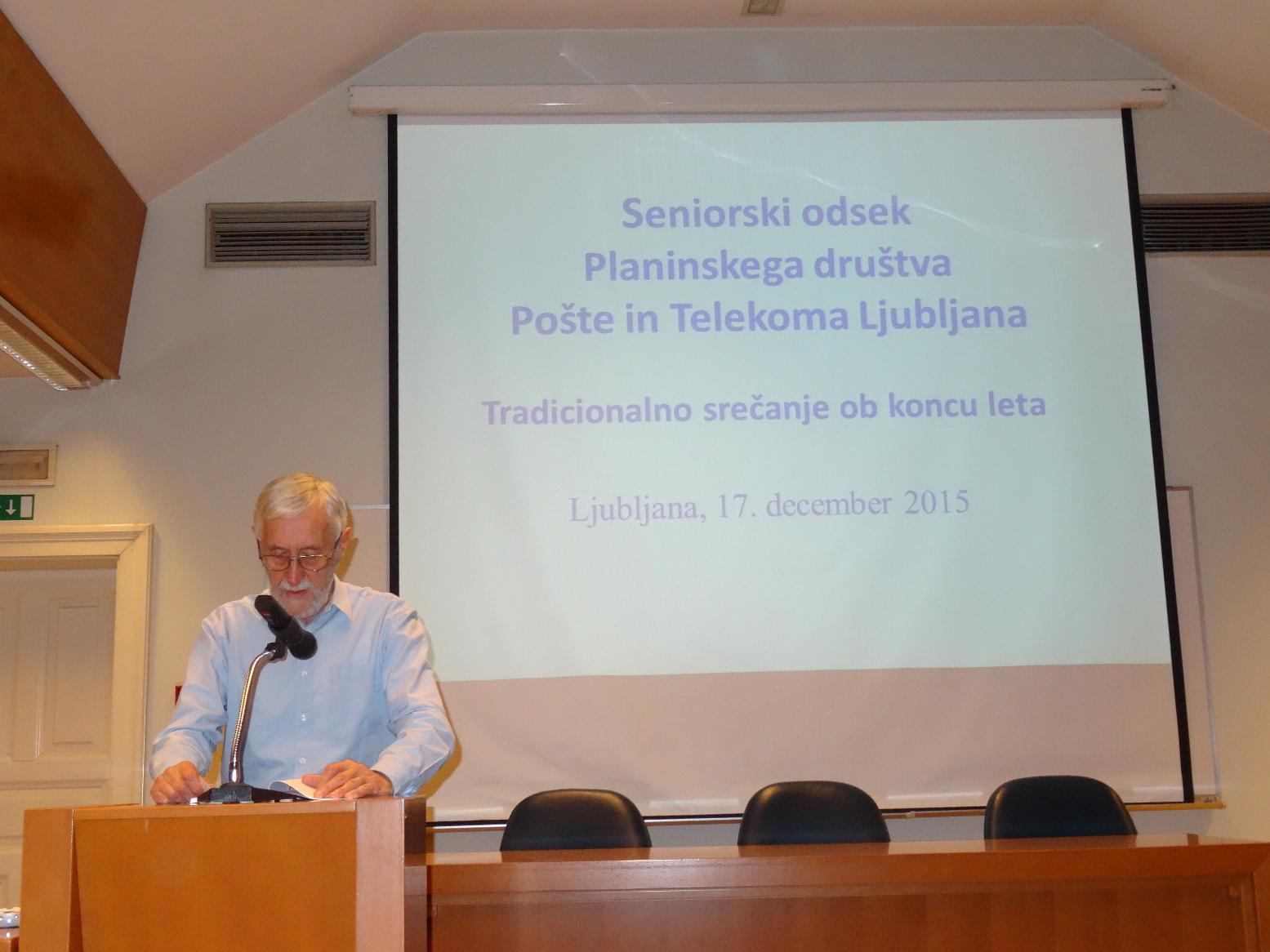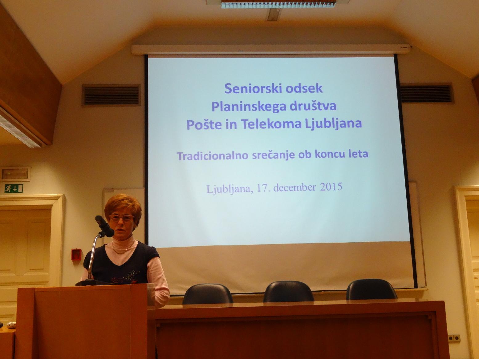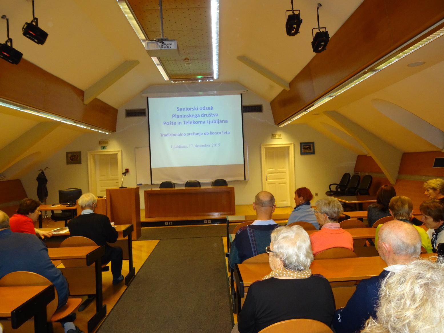 Na Glavni pošti v Ljubljani je bilo tradicionalno prednovoletno srečanje Seniorskega odseka PD Pošte in Telekoma Ljubljana, ki se ga je udeležilo okoli 60 članic in članov. Prireditev je vodila Irena Fekonja, ki je tudi recitirala pesmi Cvetke Murovec. Drago cenčič pa je deklamiral svojo Domovinsko pesem. V programu je sodelovala glasbenica na panovi piščali. Načelnik odseka Stanko Jaki je poročal o izvršenih seniorskih izletih v letu 2015, ob predstavitvi fotografij z izletov, ki jo je pripravila Barbara Ručigaj Tomšič. Nato je načelnik predstavil program seniorskih izletov v letu 2016. Na koncu je podpredsednik društva Stanislav Tomšič vsem skupaj zaželel vesele praznike ter srečno in zdravo novo leto 2016. Sledilo je družabno srečanje ob prigrizku in kozarčku rujnega, ki so ga prispevali naši vinogradniki Lojze Cuznar, Lojze Fekonja in Stanko Jaki.