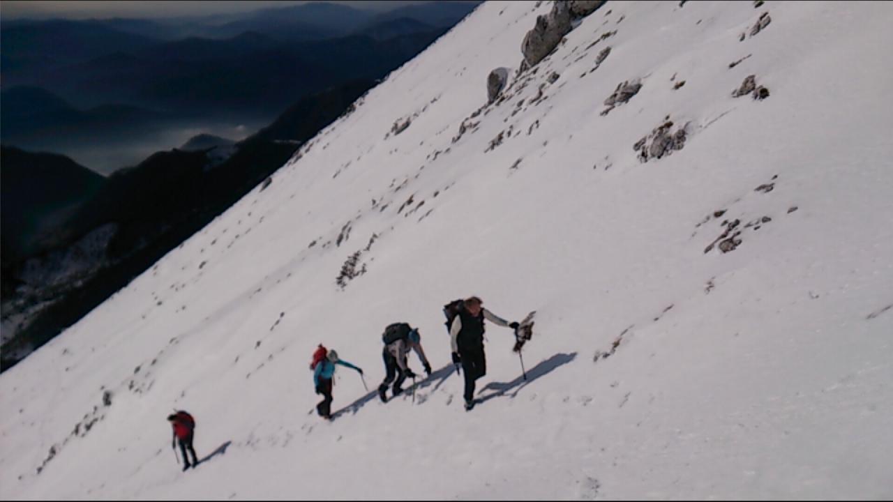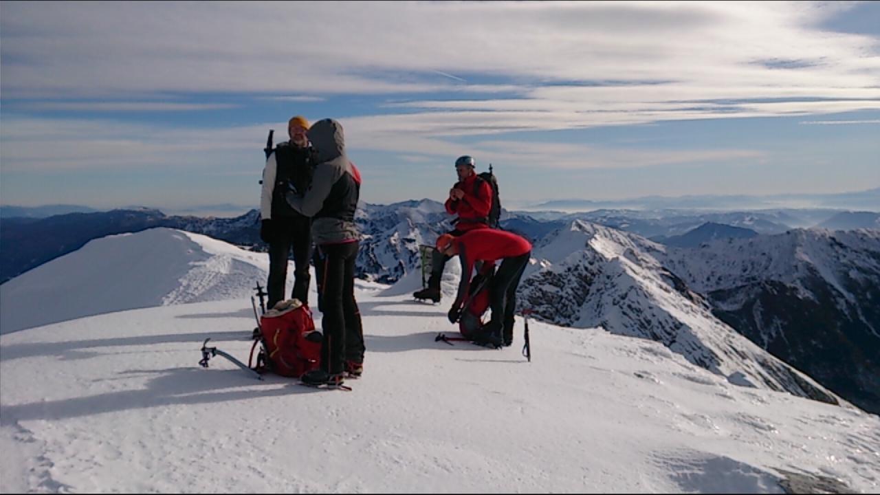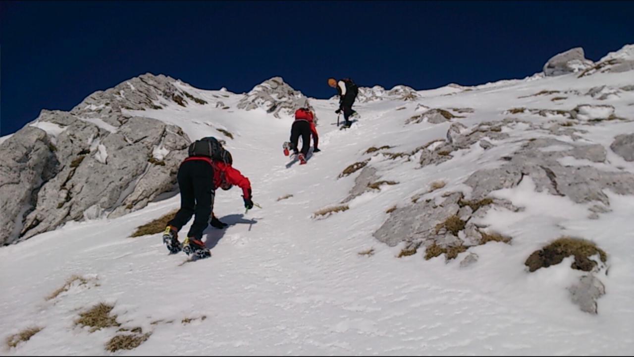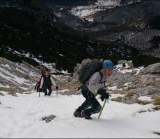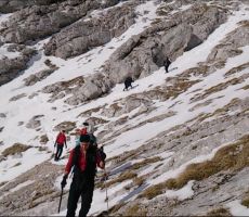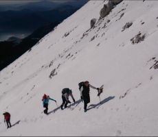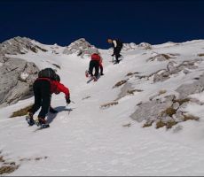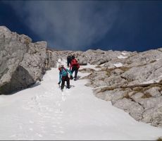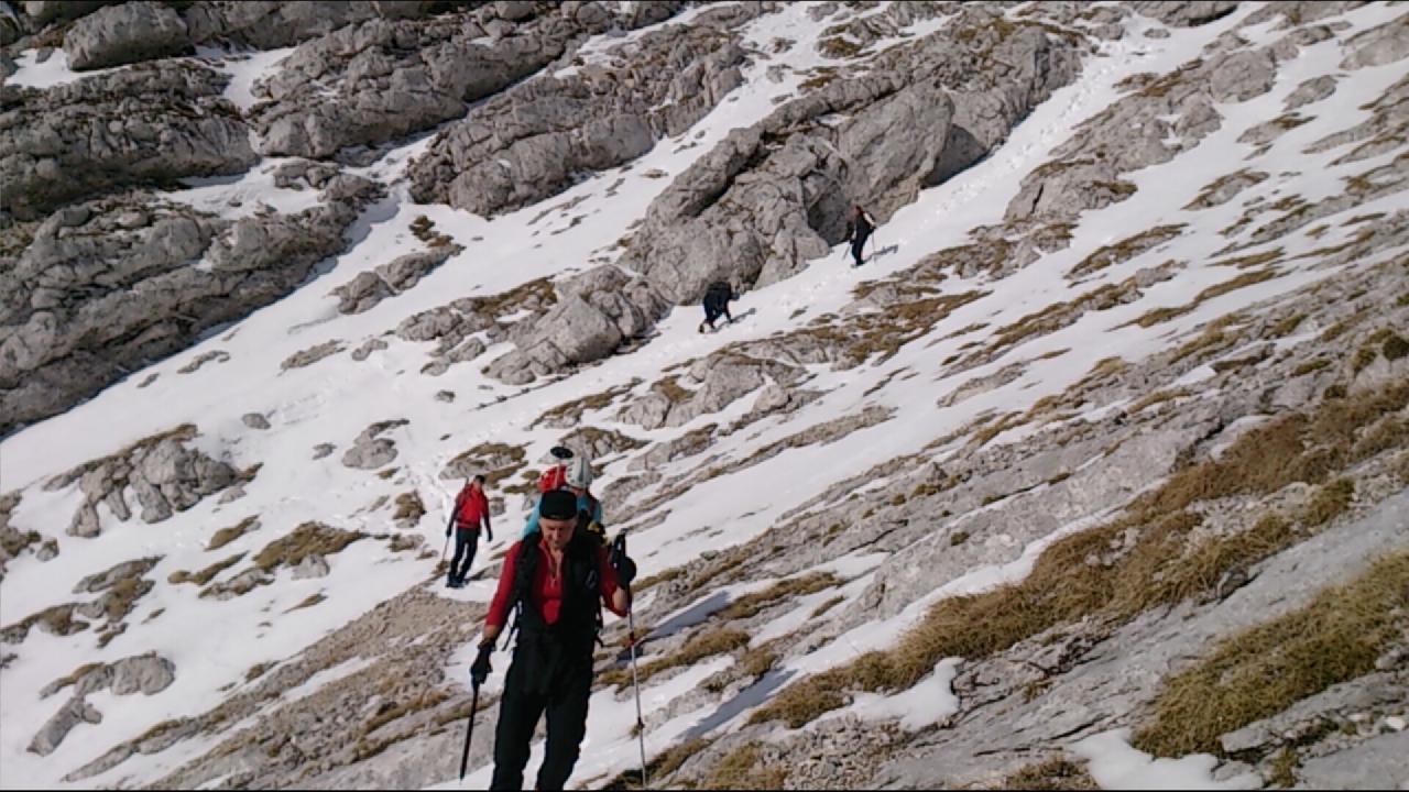 Pot smo prečili in nadaljevali ob rušju in balvanih po stezi, ki je speljana proti Škrbinski plošči. Pod ploščo smo prečili desno in se vzpeli po diagonalni grapi, kjer je bila konec rušja kratka prečka. Tukaj smo se pripraviti za tehnični vzpon. Nadeli smo si dereze (nekateri tudi čelade) in v roke vzeli cepin ter po osrednji grapi (ob robu plošče) v idealnem snegu se povzpeli na VRH NAD ŠKRBINO (2054m. Vrh je bil vetroven.