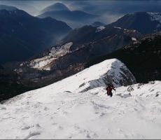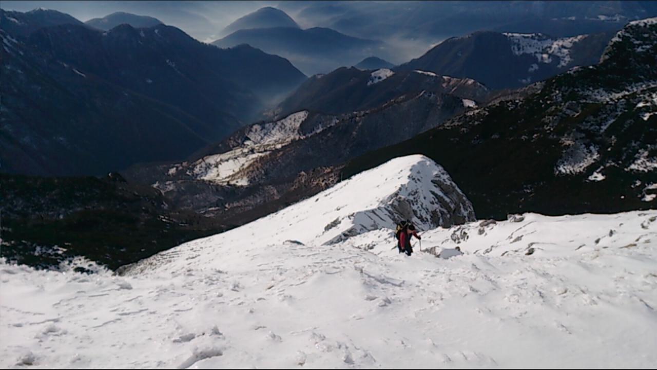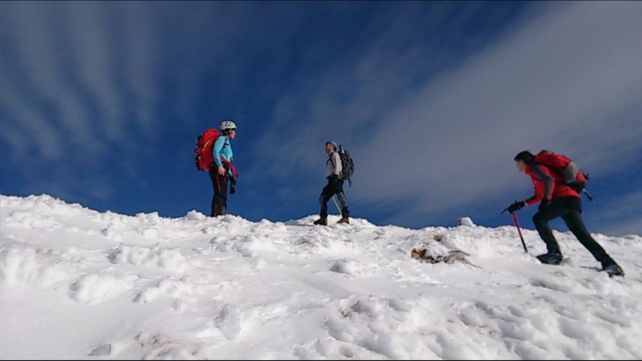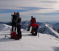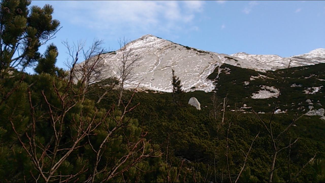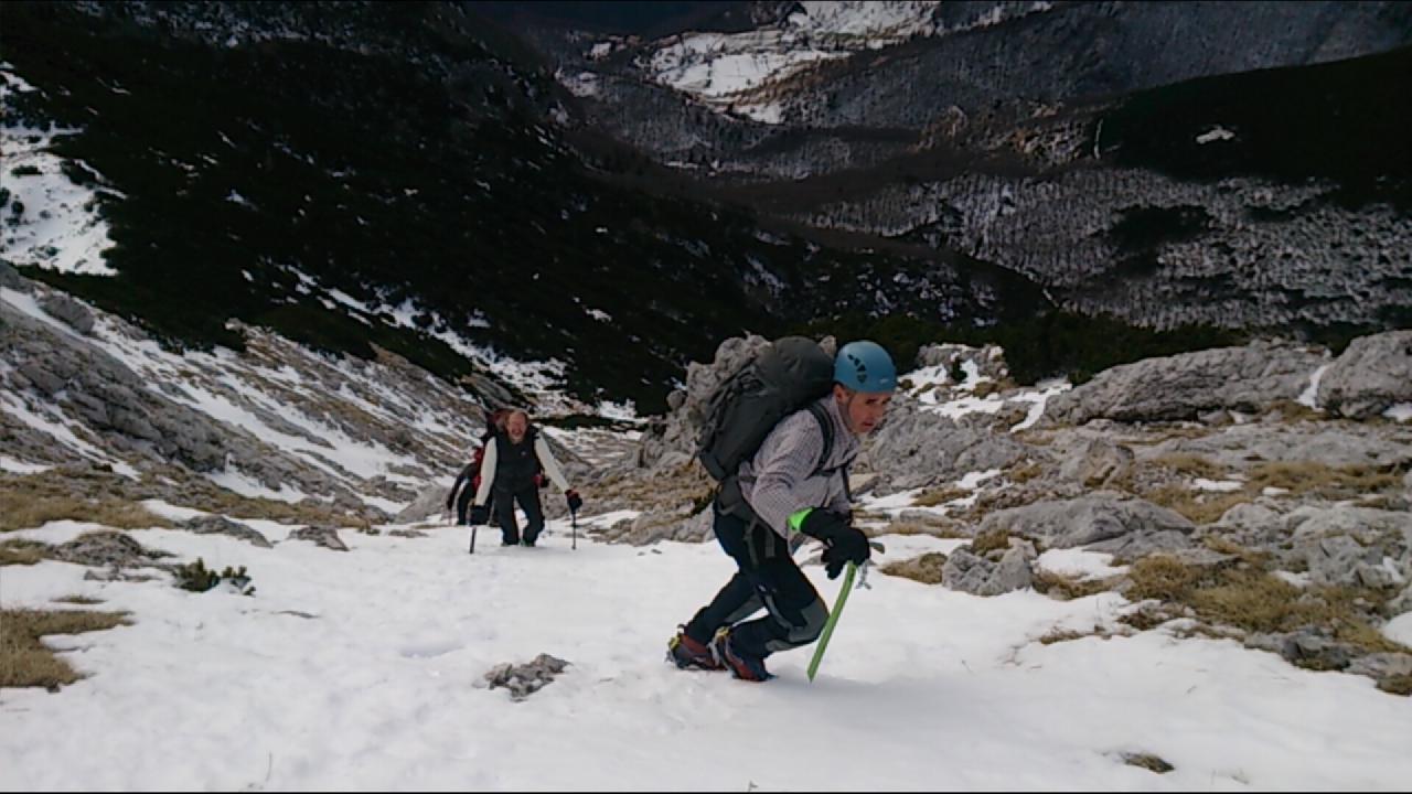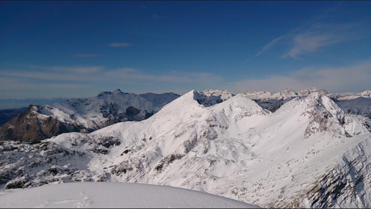 Pot smo prečili in nadaljevali ob rušju in balvanih po stezi, ki je speljana proti Škrbinski plošči. Pod ploščo smo prečili desno in se vzpeli po diagonalni grapi, kjer je bila konec rušja kratka prečka. Tukaj smo se pripraviti za tehnični vzpon. Nadeli smo si dereze (nekateri tudi čelade) in v roke vzeli cepin ter po osrednji grapi (ob robu plošče) v idealnem snegu se povzpeli na VRH NAD ŠKRBINO (2054m. Vrh je bil vetroven.