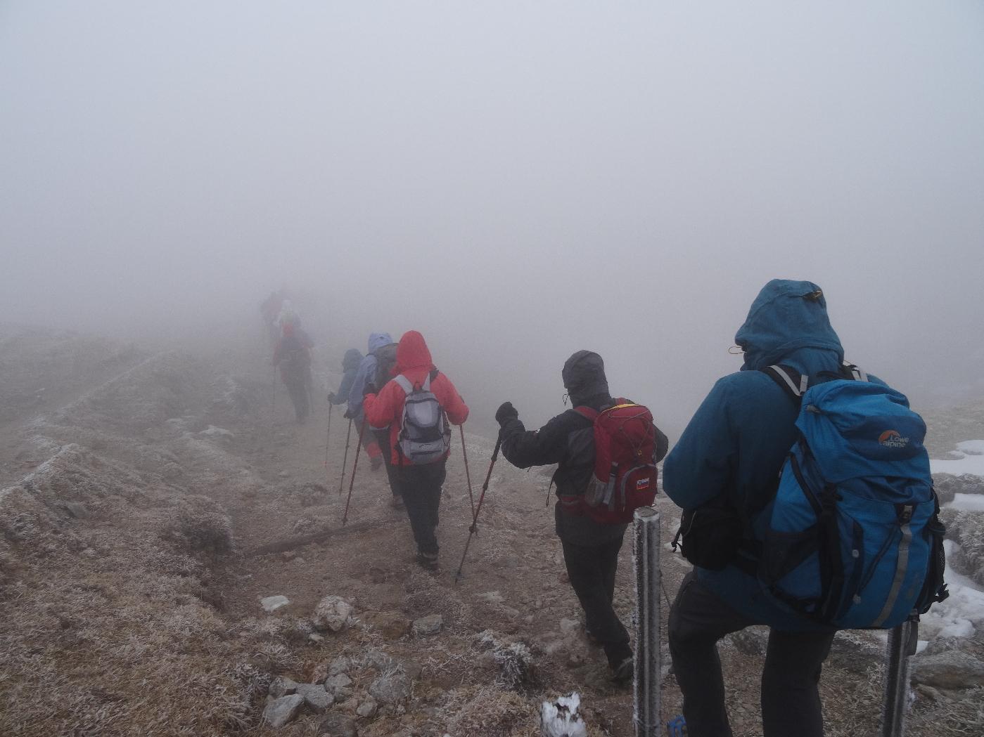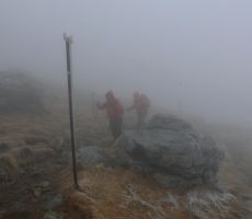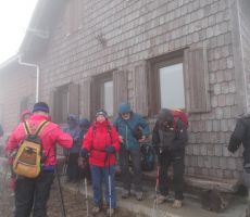 Po jutranji kavici na kmečkem turizmu smo se odpravili osvojit vrh, srečevali smo pohodnike, ki so se že vračali in povedali, da je na vrhu megla in hud veter. Tudi mi smo potonili v meglo in prvi veter nas je zajel že na sedlu Povden. Tik pod kočo nas je hotelo pa kar odpihniti.