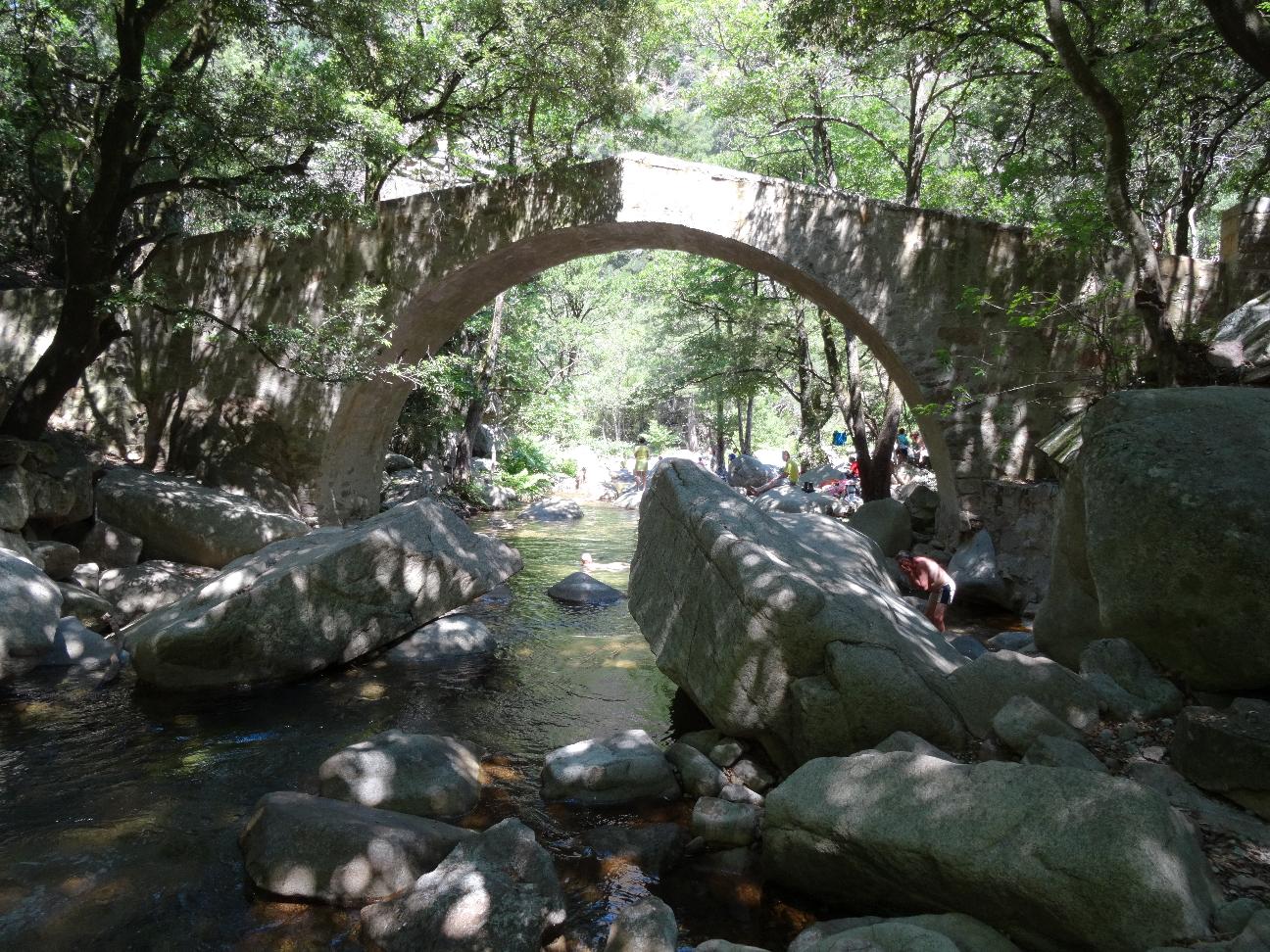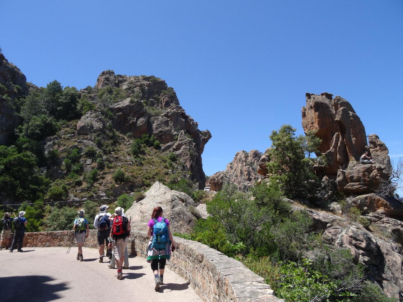 Na koncu vasi Evisa (809 m), pri pokopališču, je sledil spust po poti »Tra Mare e Monti« v čudoviti kanjon Spelunce. Na najnižji točki, pri genoveškem kamnitem mostu Ponte a` Zaglia (295 m), smo si privoščili ohladitev v tolmunih hudournika. Pri dvojnem mostu (247 m) pod vasjo Ota smo morali opraviti še precejšen del poti po asfaltu, do našega avtobusa, ki je čakal na glavni cesti (314 m).
