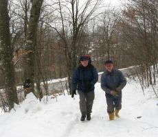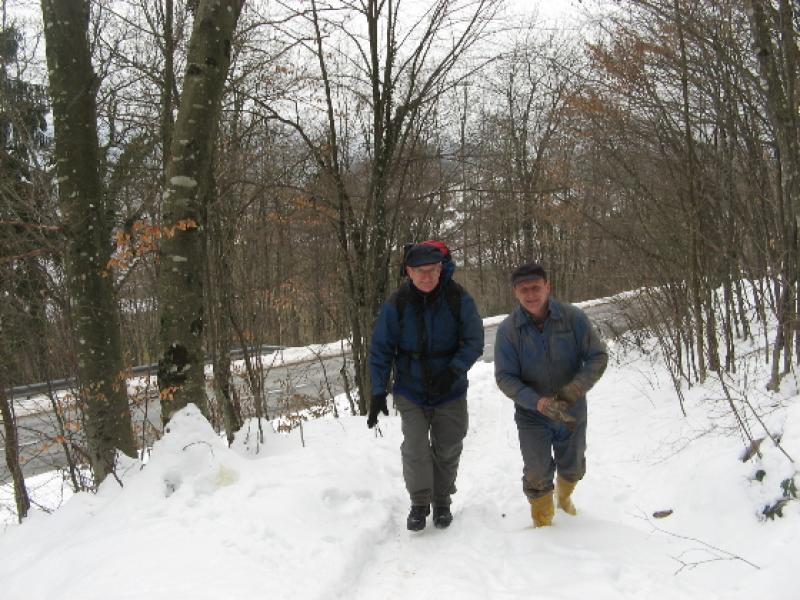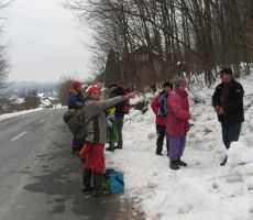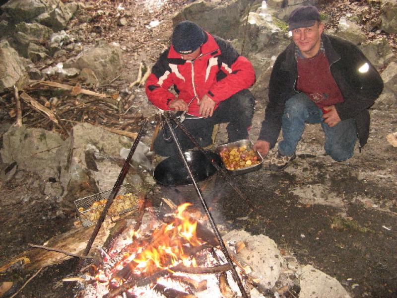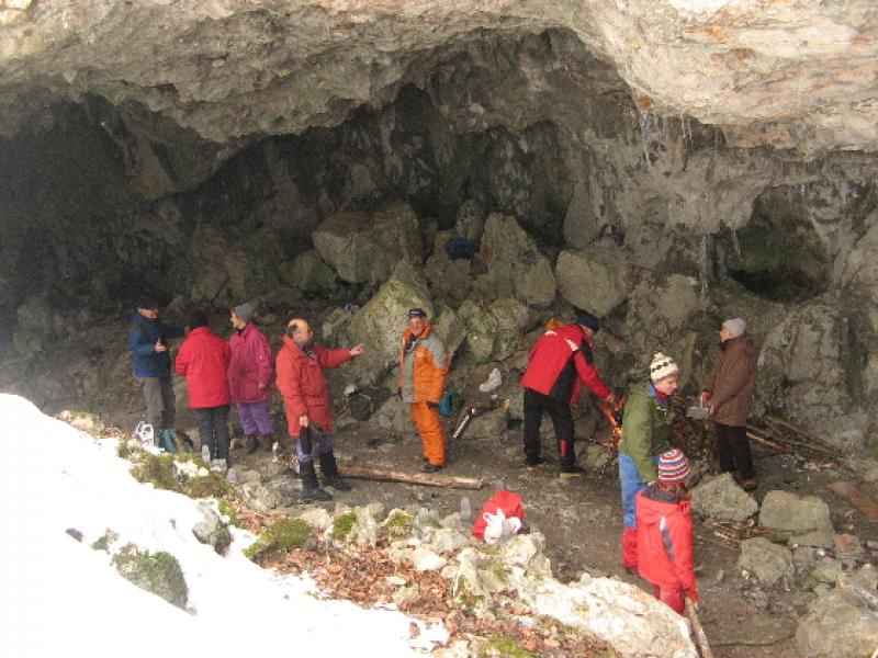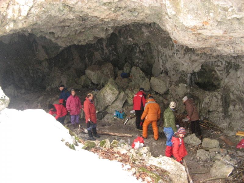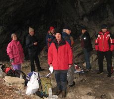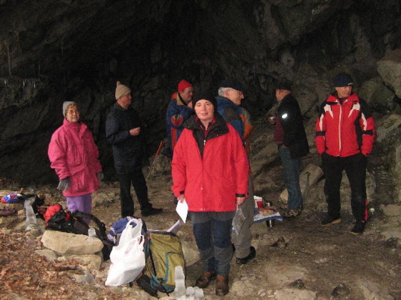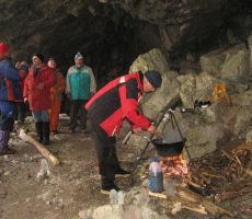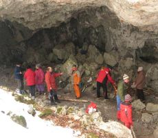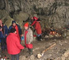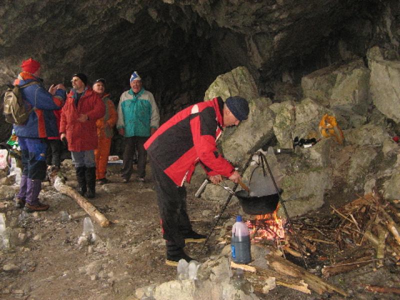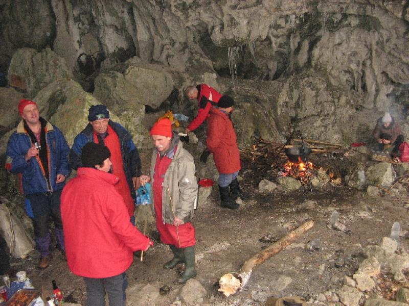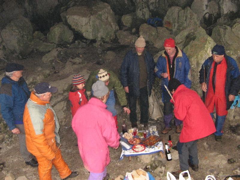 Letošnje tradicionalno ponovoletno jamarsko srečanje, že 16. po vrsti in 14. v jami Mačkovica, je za nami. Dogajalo se je v nedeljo, 24. januarja, v organizaciji Planinsko jamarskega odseka z etnološko sekcijo PD PT Ljubljana in Jamarskega društva Karlovica iz Dolenje vasi pri Cerknici. Letos smo se odločili za novost: ene pohodnike smo peljali v jamo, druge pa samo do njenega vhoda. Prvih 9 se je zbralo v Lazah ob 10. uri. Pod Jožetovim vodstvom so se spustili v Malo dvorano do velikega kapnika »Mojzesa« in se poklonili novemu letu in jamskim duhovom s Putickom na čelu. Z zanimanjem so poslušali Jožeta, ko jim je pripovedoval o jamarskih doživetjih. Ob 12. uri smo se z avtobusom pripeljali v Laze ostali in se odpravili proti jami. V vhodnem spodmolu je bilo nekaj ledenih kapnikov, a manj, kot smo jih vajeni. Ženske smo pripravile mizo s prazničnimi dobrotami. Po pozdravnih besedah smo s šampanjcem nazdravili letošnjemu letu. Letos smo imeli samo enega krščenca. Jamarski krst s »karbidom in ognjeno vodo« je prestal Andrej. Po uradnem delu srečanja smo se z ošiljenimi palicami »spravili« na krompir in hrenovke, ki sta jih pekla Zvezdana in Ljubo. Krompirjev piknik je pri jamarjih že legendaren in tej tradiciji se tudi mi radi pridružimo.