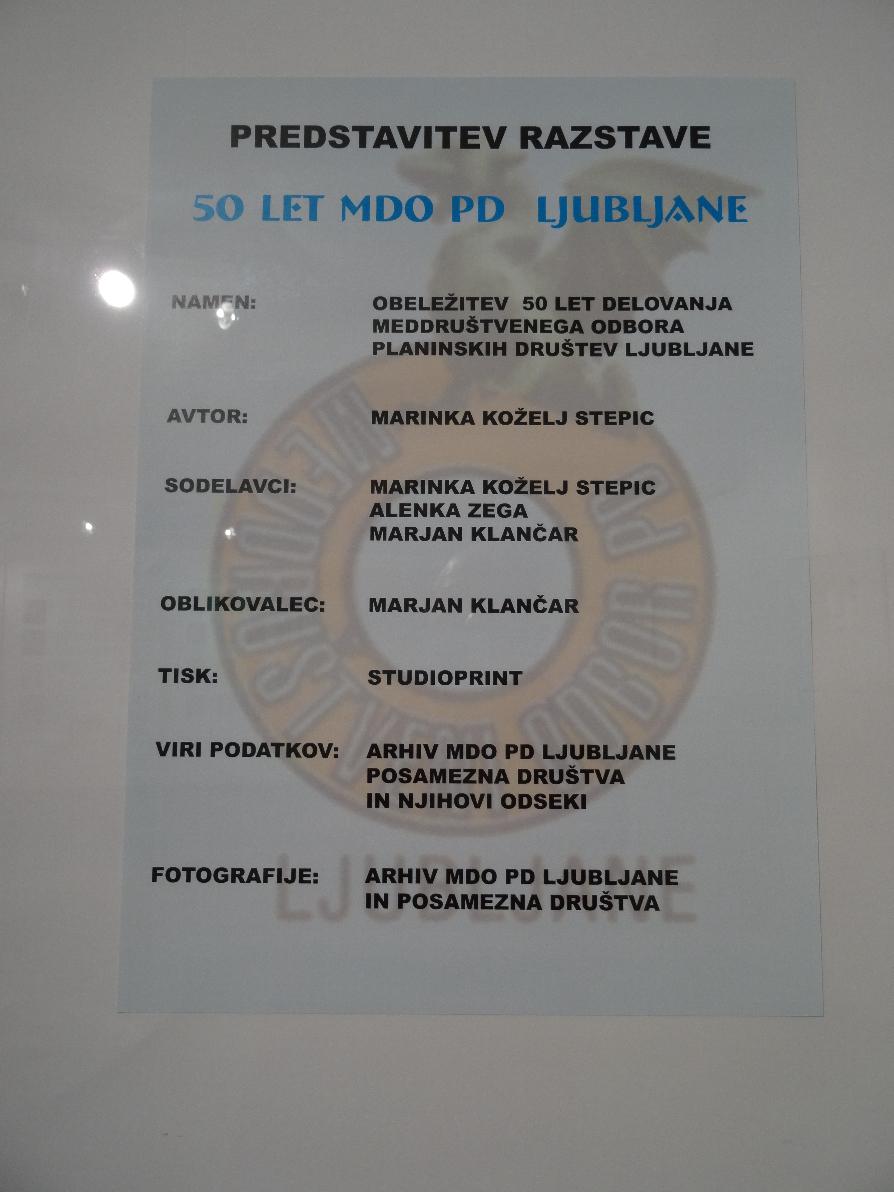 V petek, 23. septembra 2016, ob 18. uri je bila v Slovenskem planinskem muzeju v Mojstrani, otvoritev razstave ob 50-letnici Meddruštvenega odbora planinskih društev Ljubljane.
