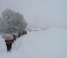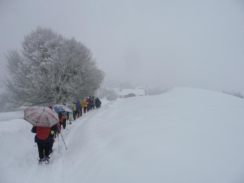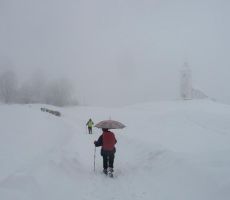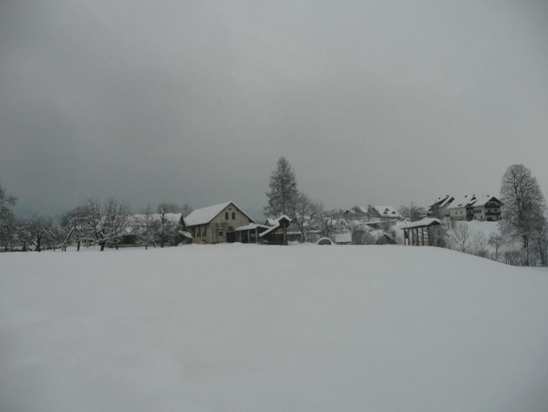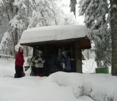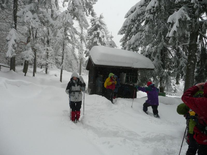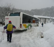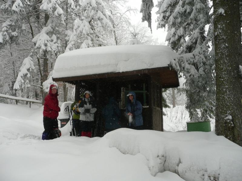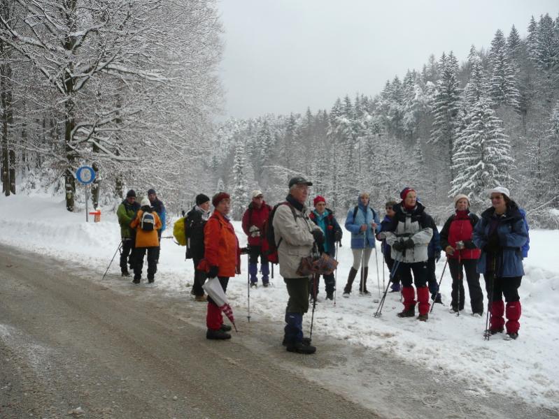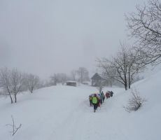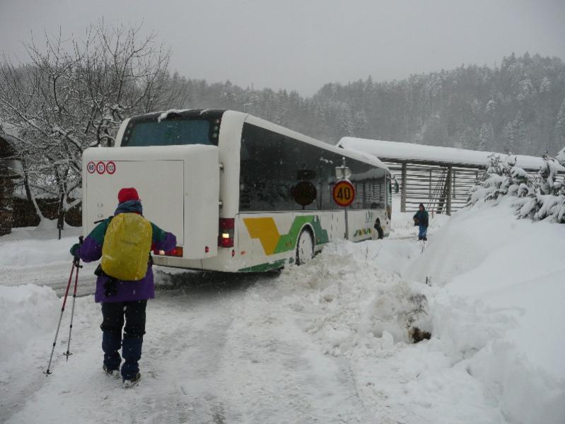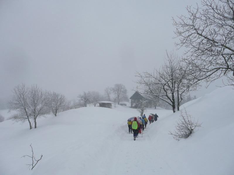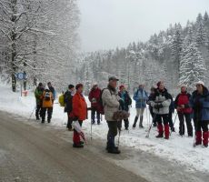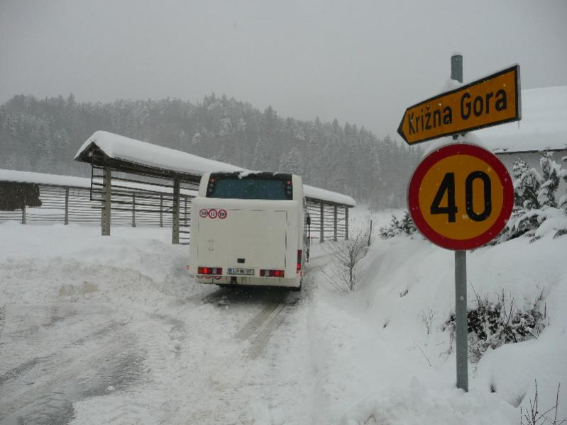 Malo naprej smo se ker po zasneženi cesti odpravili proti cerkvici na Križni gori. Vmes smo ob pomoči domačinov uspeli obrniti dolgi avtobus nazaj proti Škofji Loki, mladi voznici pa smo pomagali natakniti nove verige na avto. Skratka, bilo je pestro, zato nam je šla še bolj v slast okusna obara z žganci, v gostilni Boštjan. Prijetno podprti smo opustili prvotni načrt hoje proti Crngrobu, saj bi bilo gaženje celega snega za nekatere prenaporno, sneg pa je še kar naletaval. Vračali smo se po isti cesti, kot ob vzponu in po dobri uri in pol hoje v Škofji Loki vstopili v avtobus, ki nas je odpeljal nazaj v Ljubljano.