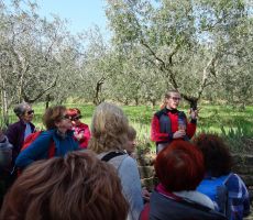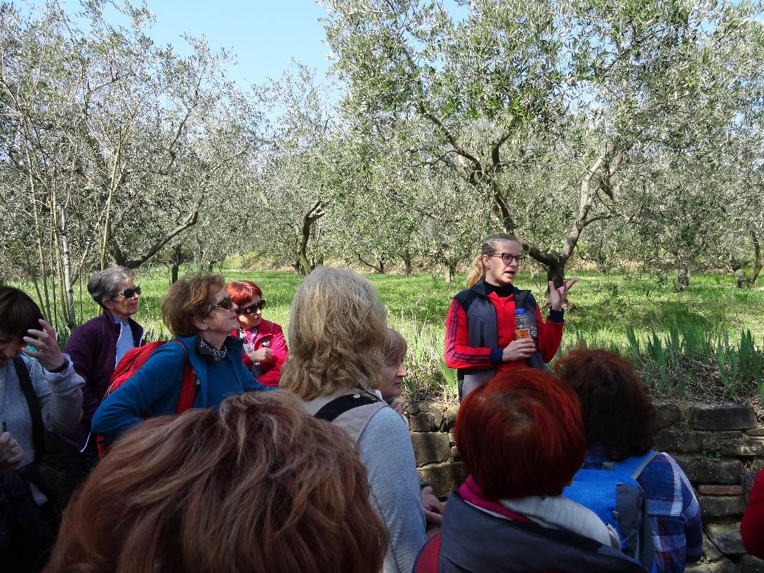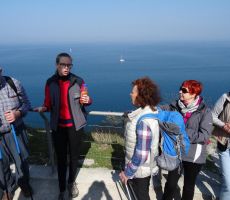 Ob11. uri nas je pri Sv. Križu pričakala gospodična Petra, strokovna vodička Krajinskega parka Strunjan. Pod njenim vodstvom smo začeli ogled po robu strunjanskega flišnega klifa in med hojo spoznavali geografske, geološke in botanične posebnosti tega zanimivega koščka slovenske obale. Ugodna morska klima in flišna podlaga sta ustvarili pogoje, ki jih domačini s pridom izkoriščajo za tradicionalno kmetovanje, s katerim so oblikovali značilno podobo Strunjanskega polotoka. Tu uspevajo oljke, kaki, vinska trta, artičoke ipd. O posebnostih krajine in morja smo se poučili tudi z informativnih tabel ob poti.