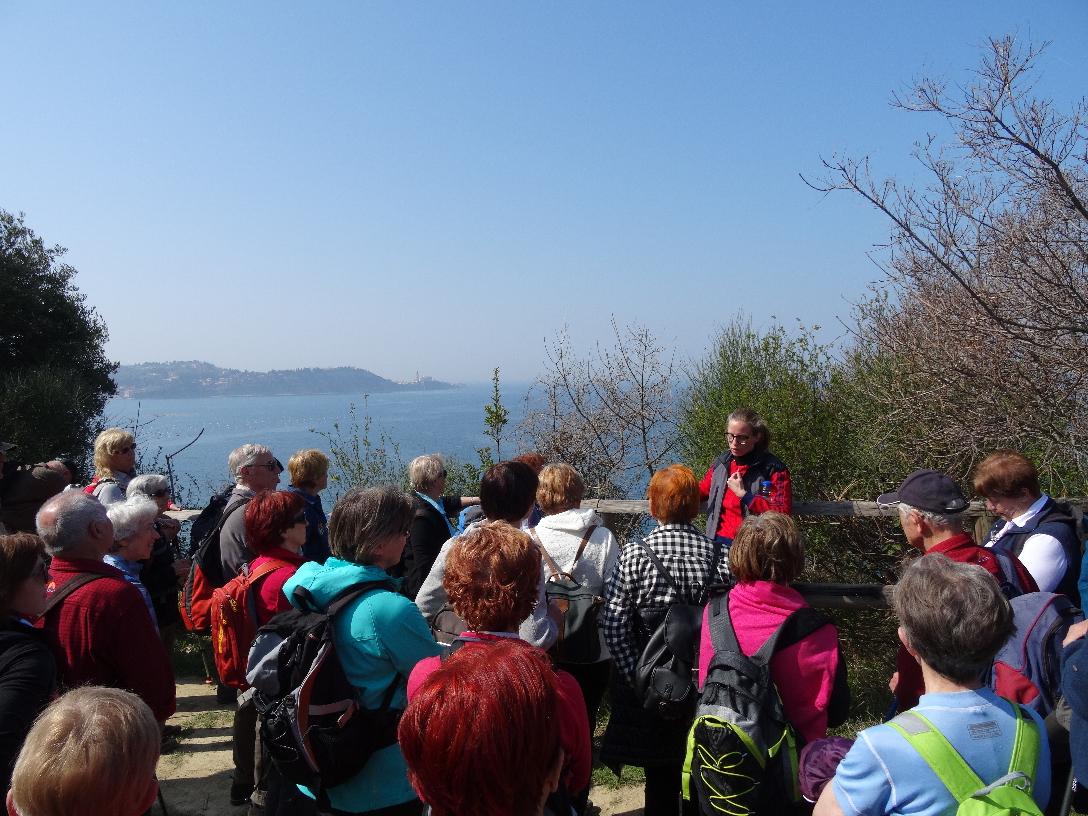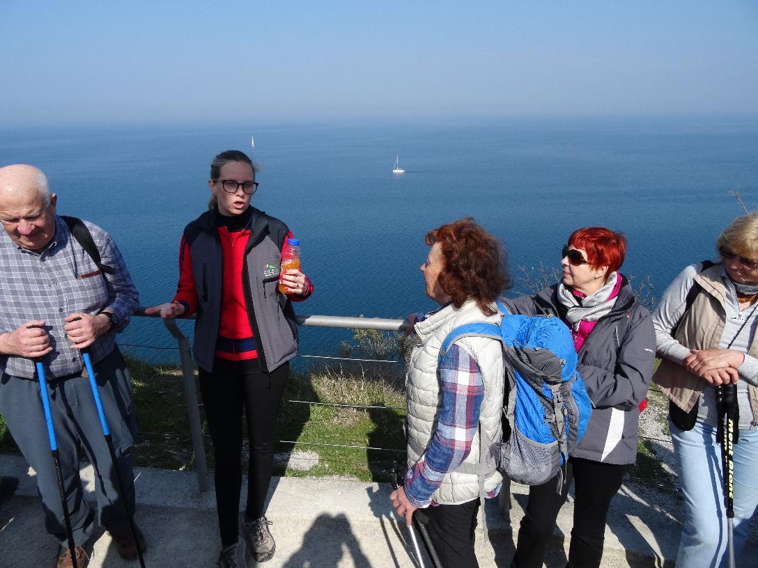 Odpeljali smo se do Belvedera nad Izolo, od koder smo se napotili proti Zalivu sv. Križa. Med hojo smo uživali razglede proti Piranu, Izoli, Kopru in Trstu, dlje pa pogledi niso segli zaradi nekoliko zamegljenega ozračja. Oddahnili smo si v oljčnem gaju in občudovali spomladansko cvetje. Hojo smo nadaljevali do Strunjanskega klifa, ki ga oblikujejo prepadne flišne stene, najvišje na Jadranu.