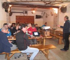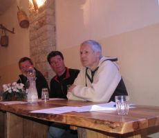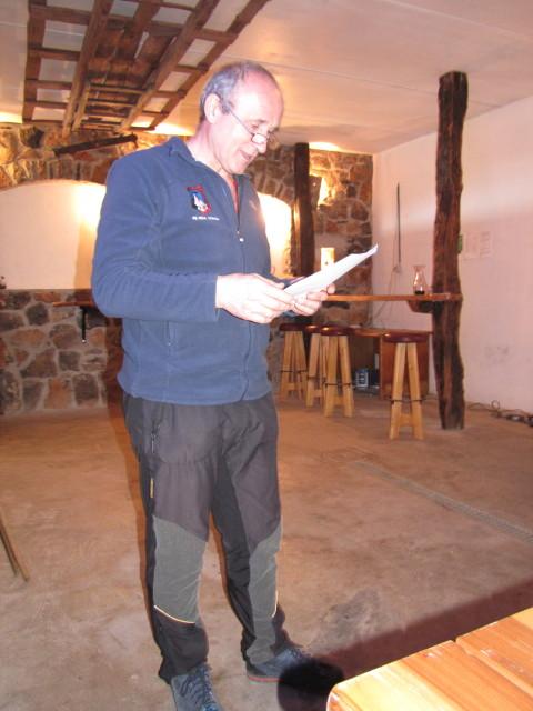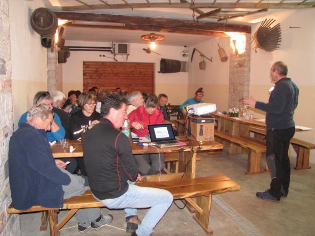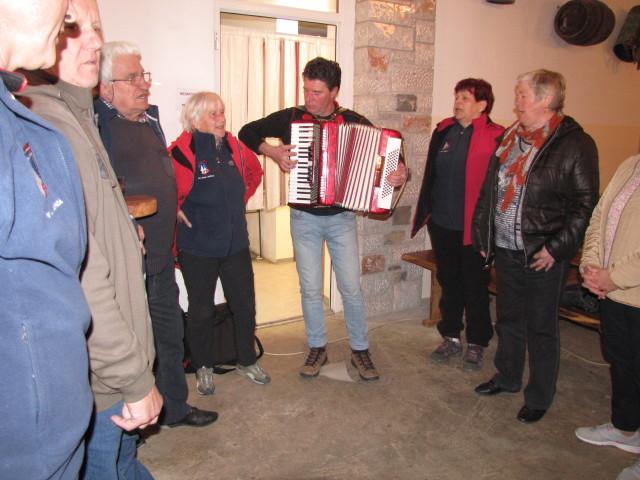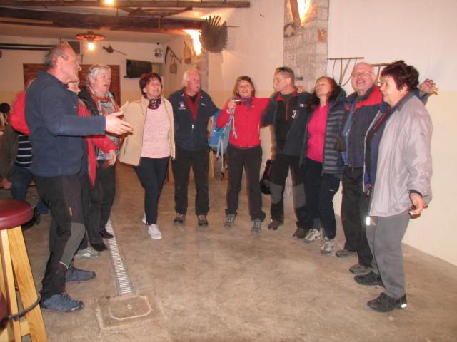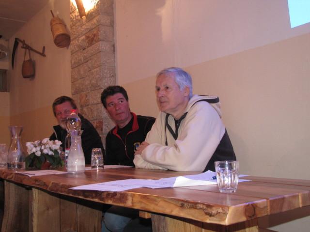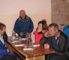 Tu smo napravili daljši počitek z malico in degustacijo salam, ki so jih prinesli s seboj naši planinci. Veselo razpoloženje ob dobri hrani in pijači nam je še polepšala razpoloženje Ingrid, ko nam je povedala, da se je odločila, da prevzame mandat za predsednika. Da ne bi zamudili uradnega dela, smo morali kar malo pohiteti še do vrha Trstelja, se v koči na hitro odžejali in se spustili nazaj v Lipo, kjer se je pričel še uradni del občnega zbora. Med povabljenimi gosti sta nas razveseli Jože Mežnar in PD Tolmin in Jožef Tišlarič in našega matičnega društva. Na zboru smo soglasno izvolili novo predsednici Ingrid Peršolja, podpredsednik pa je po novem Ivan Trampuž. Po zaključku uradnega dela smo si še napolnili prazne želodce in se malo poveselili ob harmoniki, ki jo je raztegnil naš član in gostitelj Božo.