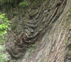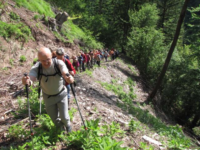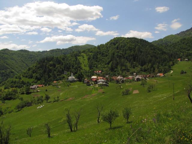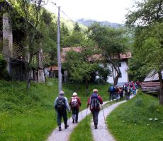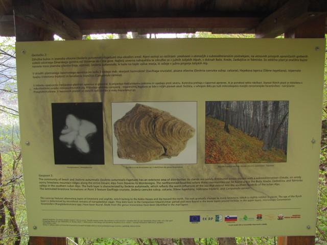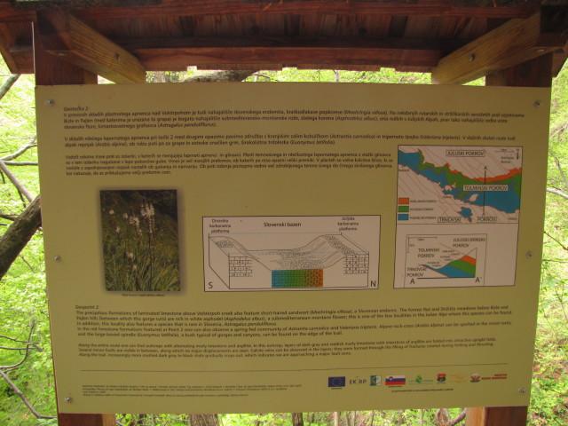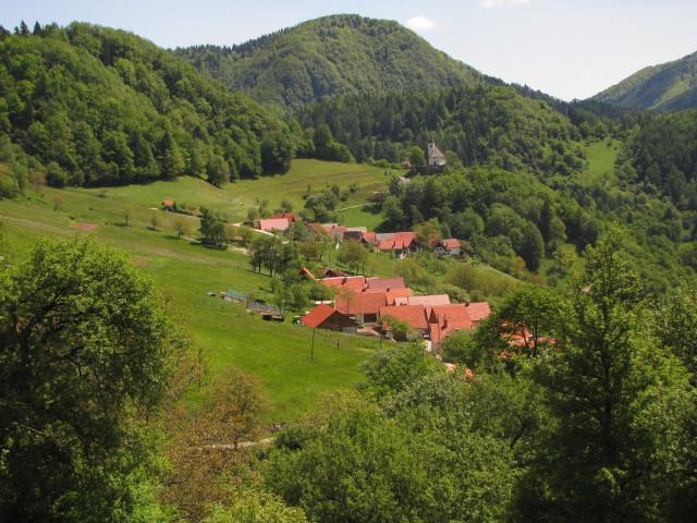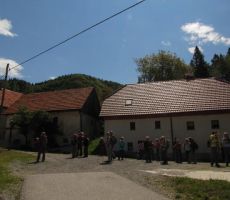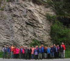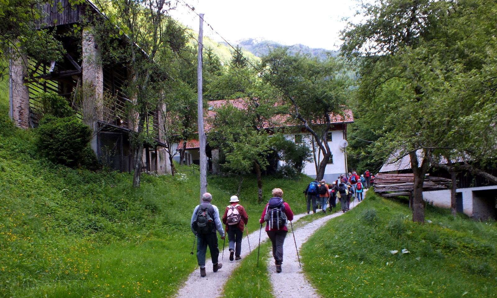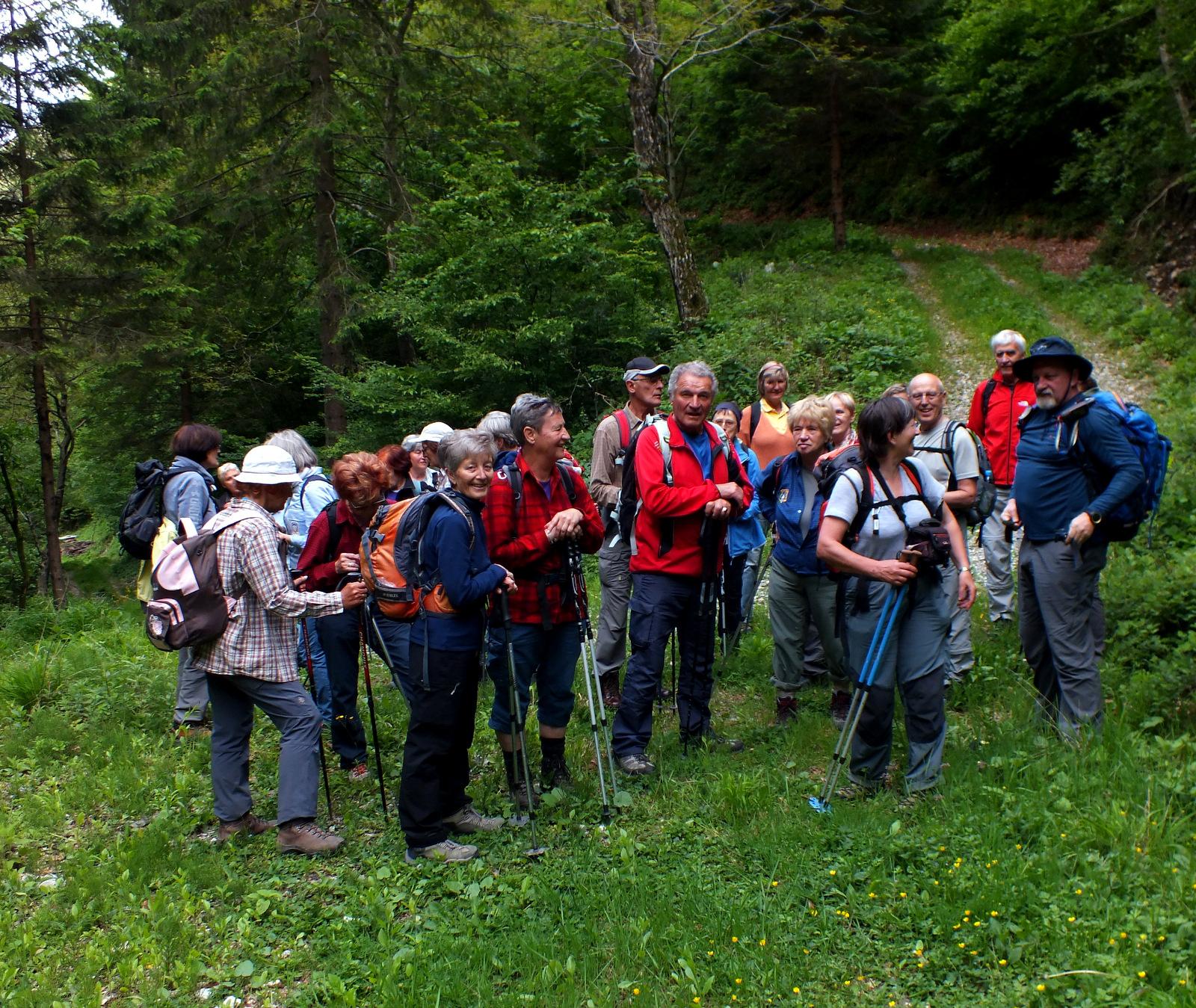 V jutranjih urah smo se zbrali v Podbrdu na kavi, od tam pa smo se skupaj zapeljali do konca vasi, kjer smo občudovali endemit kradkodlakavo popkoreso, ki je bila v polnem razcvetu. V letošnjem letu se še posebej bogato in dolgo bohoti s svojimi cvetočimi blazinami med skalnimi plastmi. Ko smo se jo nagledali in ovekovečili v fotoaparate, smo se zapeljali še malo naprej do izhodišča v skrito dolino potoka Drislpoha, po katerem nosi ime tudi tam stoječa domačija. Z glavne ceste smo se napotili skozi skalno ožino, za katero pa se odpre dolina, ki je nudila preživetje Drslpoharjevi domačiji. Razširjen del doline se zaključi s pogledom na vrh Črne prsti in z manjšim slapom. Nad njim je še nekaj slapov a so dostopni le s poti, ki je včasih povezovala Drislpoh , Trtnik in Kal (skozi Burklce). Mi smo se tokrat odpravili po poti, ki nas je pripeljala na sedlo med Kalom in Kukom. Tu se nam odpre razgled na Stržišče in na greben med Črno prstjo in Rodico oz na Matajurki vrh (Hohkogl)in Raskavec. Vsi vrhovi v Pečeh so prvotno imeli nemška imena. V prijetnem toplem soncu smo nadaljevali proti lepo obnovljeni vasi Kal, v kateri pa že nekaj let ni več stalnih prebivalcev in vas zaživi le med dopusti in ob vikendih. Veliko domačinov, ki so šli za boljšim kruhom v dolino in v mesta, se zelo rada vrača v domače kraje po Črno prstjo. Po cesti, ki se vije skozi polja – travnike smo se povzpeli mimo cerkve sv. Ožbolta do Stržišča, se sprehodili skozi vas, ki je kljub majhnemu številu stalno živečih ljudi lepo obnovljena in urejena. Ljudje izpod Črne prsti in Rodice (Gredice) se vedno sloveli po tem, da so bili njihovi domovi in kmetije zelo lepo urejene. Pa tudi za osebno urejenost so zelo poskrbeli. Ko smo zapustili vas nas je čakal še manjši vzpon po gozdni cesti na Mrhek, tu pa smo se priključili na geološko pot, ki pride s Kalarskega brda. Mulatjero so zgradili Italijani med obema vojnama in je služila za oskrbo vojaških utrdb nad naselji, saj je po grebenu potekala Rapalska meja. Ob poti smo srečevali zelo pestro strukturo kamnin: od monolitnega kamna, skrilovca (služil je za kritino onjektov), konglomerata do kamnine v plasteh, ki se je lomila v razno raznih oblikah. Na vsakih par korakov so bile kamnine drugačne. Tudi rastlinski svet je tu zelo raznovrsten in pester. Pod Lajtam smo zapustili geološko pot in se po stezi skozi grmovje in Rutarske pašnike in travnike odpravili proti Rutu. Ko smo prišli iz gozda, so se pred nami odprli Rutarski travniki, za njimi pa je slonela vasica stisnjena v zavetje grička, za katerim se skriva vasica Grant. V Rutu smo si ogledali še cerkev sv. Lambreta in znamenito več stoletno lipo. Točnega podatka, kdaj je bila cerkev zgrajena ni, bila pa je večkrat dozidana. Omenja se že leta 1348, župnija pa je postala leta 1356 in je prvotno služila za vasi: Grant, Rut, Stržišče, Kal, Kuk in Znojile. Sedanjo obliko je dobila leta 1890. 1893 je dokončal poslikave v cerkvi Clemente DelˈNeri. Ob zadnjih restavratorskih delih so ugotovili, da so poslikave v več plasteh.