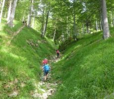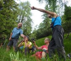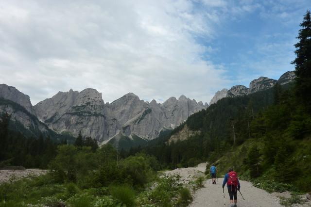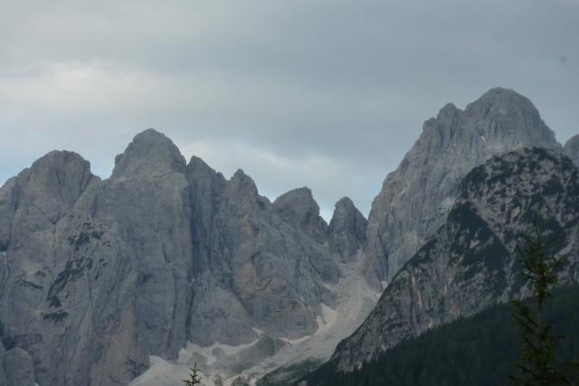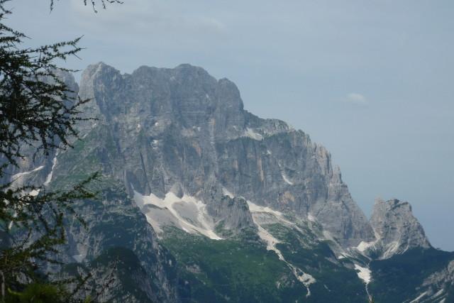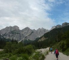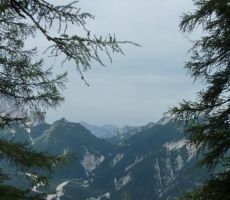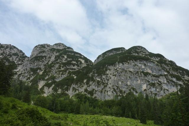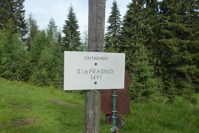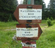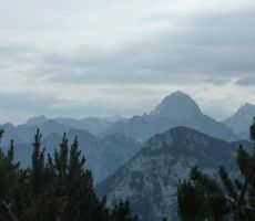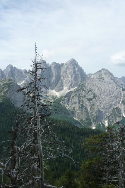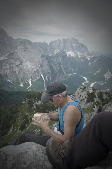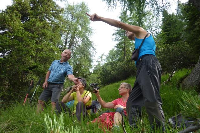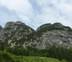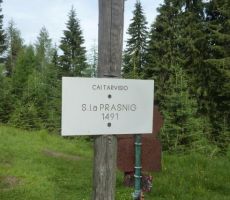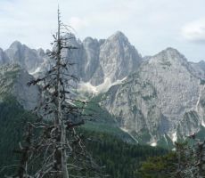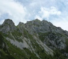 Ker se nas je za turo odločilo samo 5 udeležencev, smo se že pred odhodom dogovorili za drug cilj: Kamniti Lovec nad Višarjami. Prav tako je zaradi zahtevnosti poti prevzela vodenje Ingrid Peršolja. Štartali smo ob 5:15 iz Solkana in krenili preko Bovca čez Predel v Italijo do vasice Riofreddo (Mrzle Vode). Ti smo parkirali pred zapornico na poti in po označeni proti št. 618 krenili po dolini navzgor. Ker smo si želeli počasi se vzpenjajočo pot skrajšati, smo jo ubrali po strmem gozdu naravnost navzgor. Tako smo se približno uro časa prebijali med živalskimi stezami in grapami navzgor, dokler nismo dosegli markirane poti št. 615 na sedlo Prašnik. Tu se poti na Kamnitega Lovca priključi steza iz Val Brune. Po kratkem počitku in uživanju v razgledu na Nabojs, Viš, Montaž in ostale severne stene vrhov v bližini smo nadaljevali z vzpenjanjem in približno ob 11. dosegli vrh. Vračali smo se preko Planine Višarje v začetku po poti št. 613, nato pa po nemarkirani stezi do vasi Riofreddo in do našega izhodišča. |