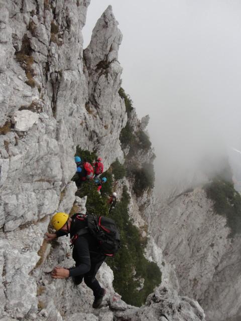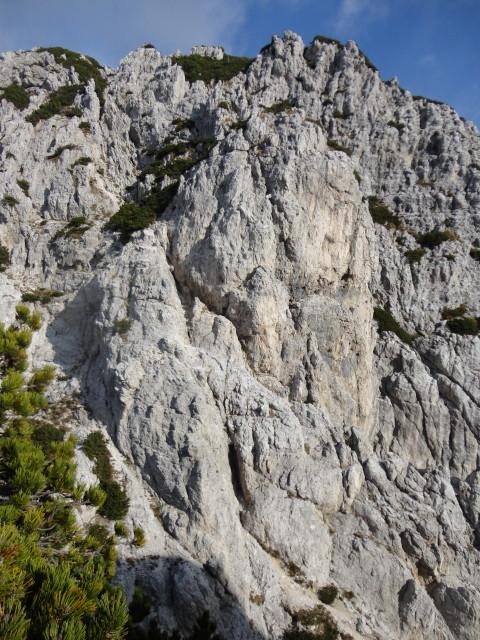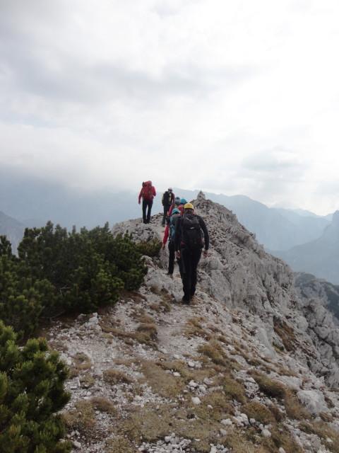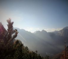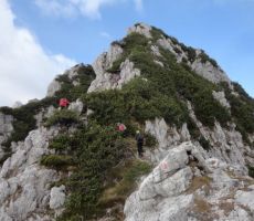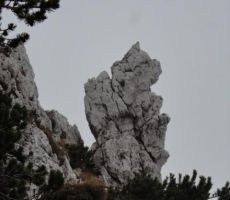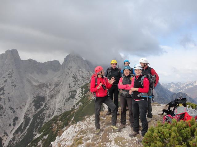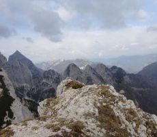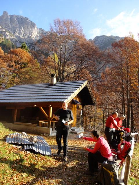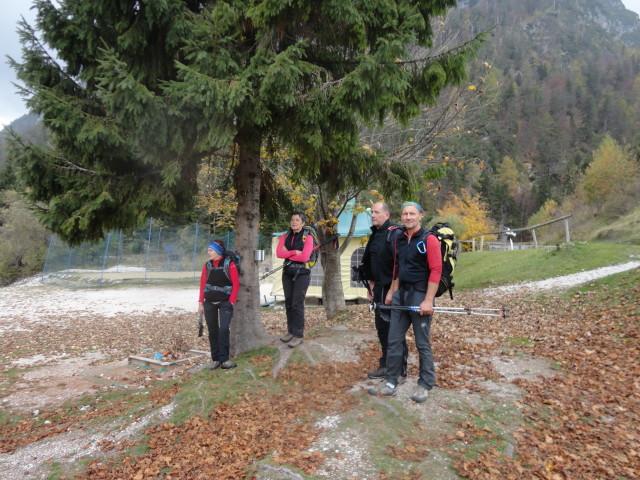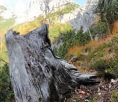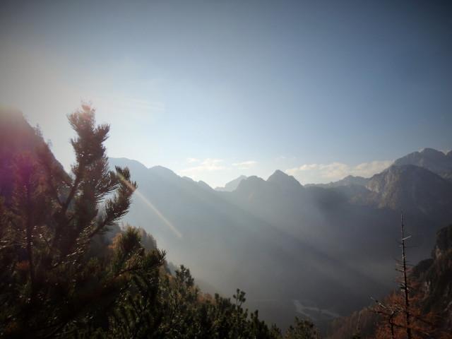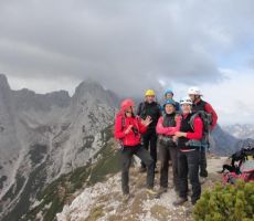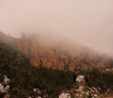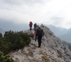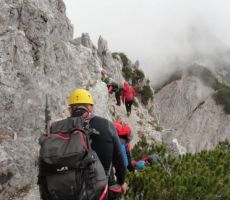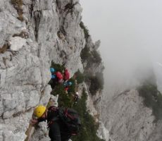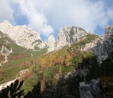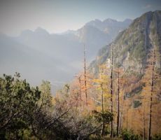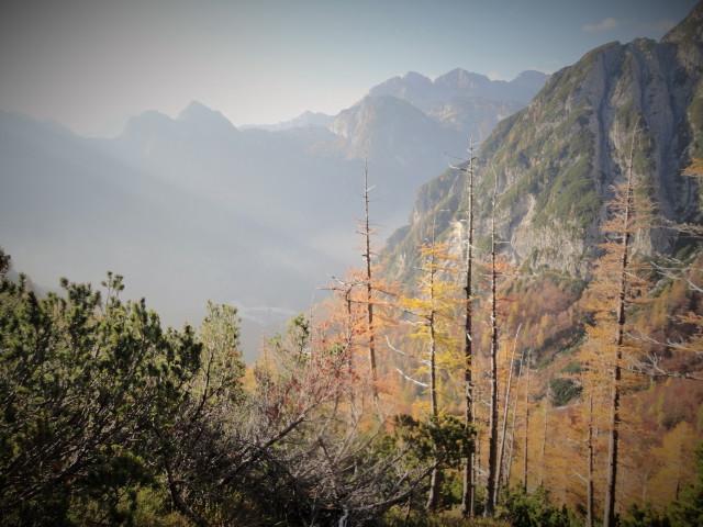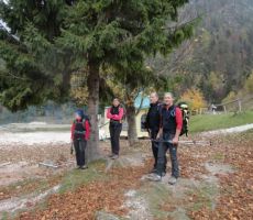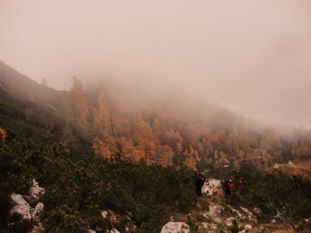 Kker so jutra morka in je zato skala spolzka in zaradi ne preveč dobre napovedi, sem spremenila smer izleta. Namesto na Veliki Nabojs, smo se odločili iti na Visoko polico. Zapeljali smo se do Rajbelskega jezera. Od tam, mimo koče Bruner, po močno strmi navpični poti na sedlo Forcella delle Cenge, 1820m. Bili smo v čarobnem svetu zlatih macesnov, zelenega ruševja, šumečih potokov, sonca in viskokih vrhov. Od tu dalje pa začne zahtevnejši del. Najprej spust in nato lahko poplezavnje in nato skoz ruševnje po našpičenem grebenu na vrh. Na vrhupa, kot na povelje sonce je ugasnilo in z njim vsa toplota tega dne. Veter je podil na tone megle iz doline. Iz daljave je veter prinašal snegec. Zato smo se toplo oblekli, dali kape na glavo in rokavice na roke, se kar obrnili in hitro sestopili na sedlo. Dolina je bila ovita v debelo meglo. Mi pa smo po poti ki vodi v Rajbel, prek raznih bljižnic hiteli v dolino. Izbrali smo krožno pot. Megla nas je spremljala in tudi „žegenj“ z neba smo prejeli. Pa ni bil tako močan, saj smo suhi prišli do jezera in do naših vozil