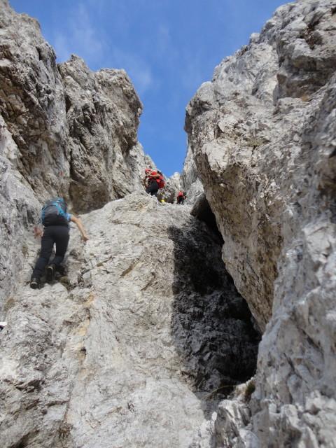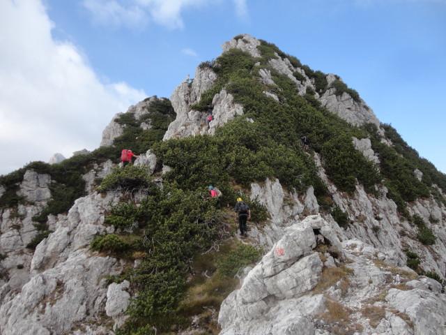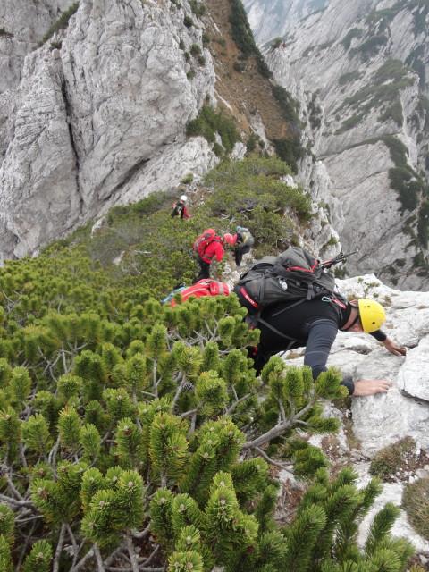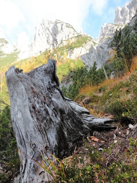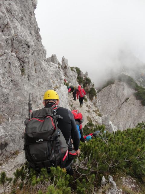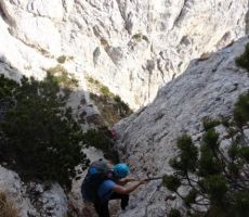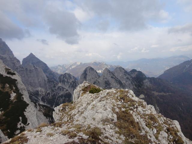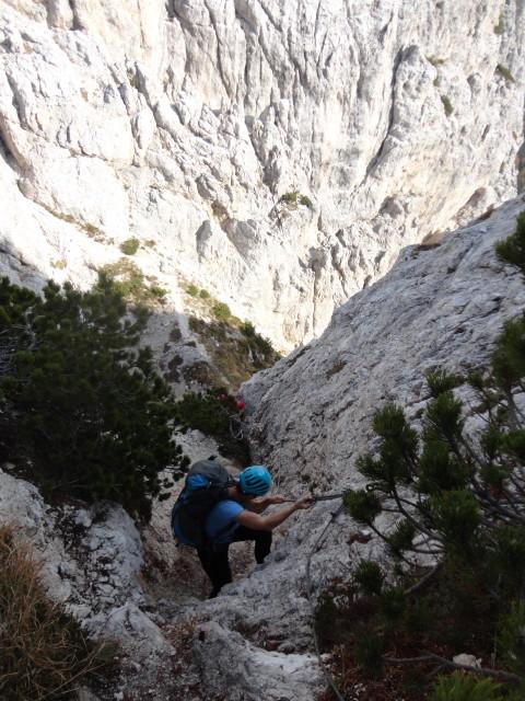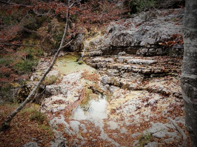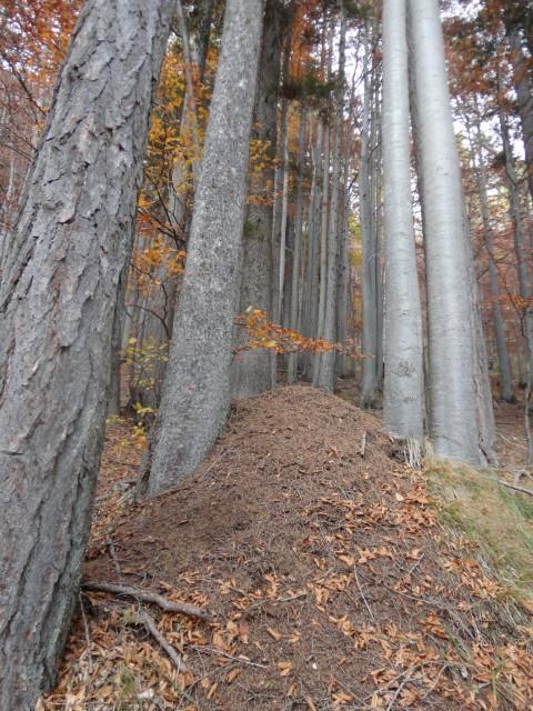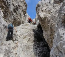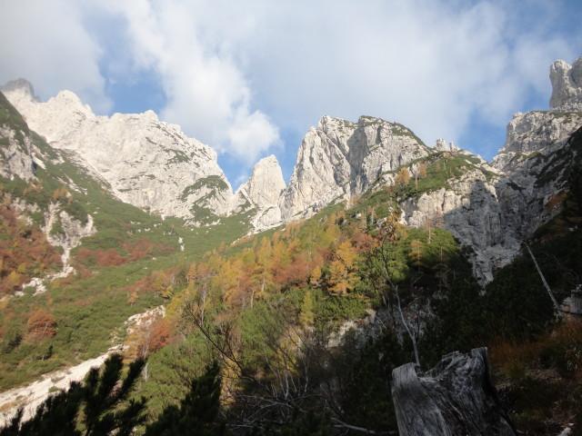 Kker so jutra morka in je zato skala spolzka in zaradi ne preveč dobre napovedi, sem spremenila smer izleta. Namesto na Veliki Nabojs, smo se odločili iti na Visoko polico. Zapeljali smo se do Rajbelskega jezera. Od tam, mimo koče Bruner, po močno strmi navpični poti na sedlo Forcella delle Cenge, 1820m. Bili smo v čarobnem svetu zlatih macesnov, zelenega ruševja, šumečih potokov, sonca in viskokih vrhov. Od tu dalje pa začne zahtevnejši del. Najprej spust in nato lahko poplezavnje in nato skoz ruševnje po našpičenem grebenu na vrh. Na vrhupa, kot na povelje sonce je ugasnilo in z njim vsa toplota tega dne. Veter je podil na tone megle iz doline. Iz daljave je veter prinašal snegec. Zato smo se toplo oblekli, dali kape na glavo in rokavice na roke, se kar obrnili in hitro sestopili na sedlo. Dolina je bila ovita v debelo meglo. Mi pa smo po poti ki vodi v Rajbel, prek raznih bljižnic hiteli v dolino. Izbrali smo krožno pot. Megla nas je spremljala in tudi „žegenj“ z neba smo prejeli. Pa ni bil tako močan, saj smo suhi prišli do jezera in do naših vozil