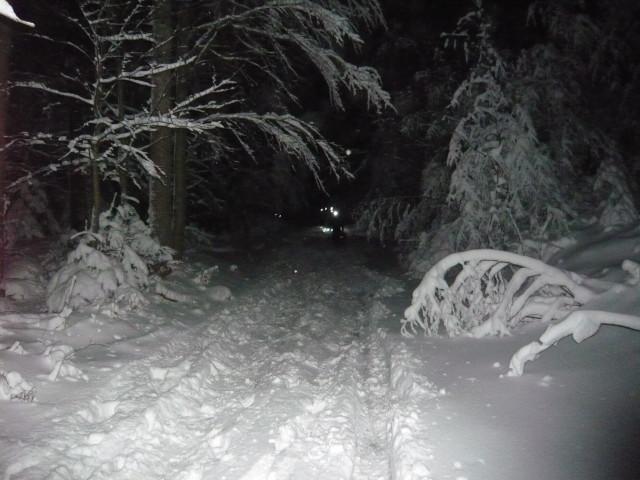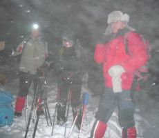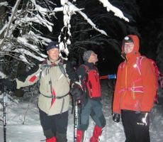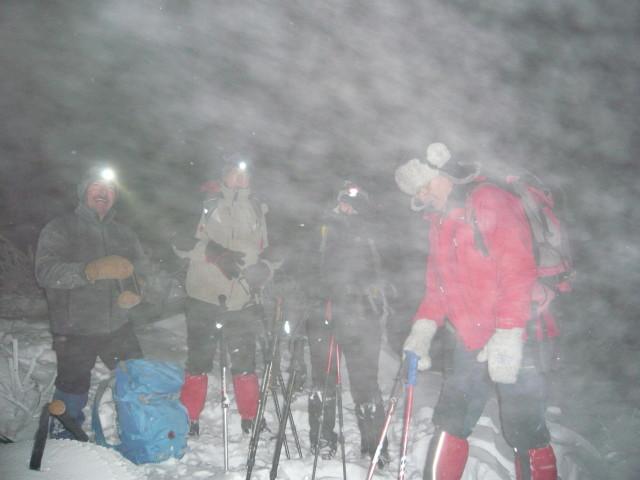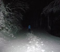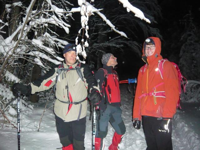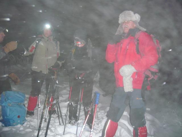 Čakli smo do zadnjega dne na dobro vremensko napoved. In res se nam je uresničila zapadlo je zadosti snega in se zvečer zjasnilo na kar so bili nekateri prav presenečeni, da se je tako lepo izteklo. Dobili smo se kot je bilo po programu na petek zvečer ob polni luni ob 18,30 na parkirišču v Ajdovščini ob cesti za na Predmejo. Kos smo bili vsi zbrani v lepem številu 17 udeležencev in 4 naši štirinožci smo se previdno zapeljali po delno zasneženi cesti na naše izhodišče. Družba za taki pohod je bila zares prava, vsi uneto pripravljeni. Začeli smo po gozdni poti v smer proti Korenitki in ker je zapadlo kar čez pol metra snega je bilo potrebno gaziti po ne shojenem snegu v rahli burji. Vzpoan je trajal kar dobre 3 ure do vrah malega Glaka. Vsi smo z kar nekaj napora dosegli vrh malega Golaka ,kjer nas je presenetil lahko rečemo presenetljivo močan veter.