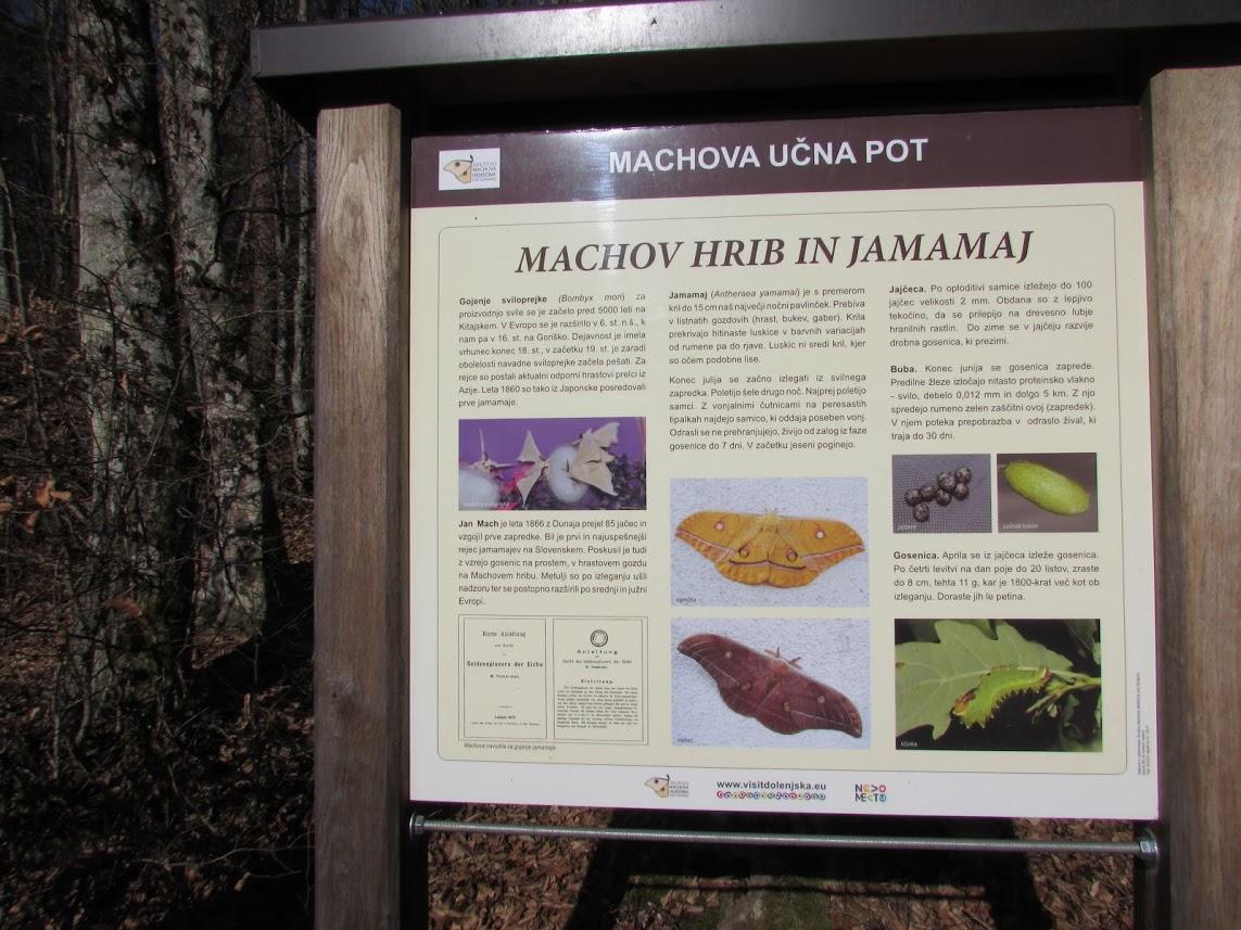 Lokalna planinka, članica PS Novo Mesto nas je pričakala na dvorišču Amigo bara. Na dvorišču so za ogrado bili občudovanja vredni konji, pod streho dve kočiji in druga jahalna oprema. Toda časa za občudovanje teh plemenitih živali in konjske opreme ter vprege je bilo malo. Anica nas je vabila v lokal na kavo. Po hitro popiti kavi smo krenili na pot. Na številnih točkah, dobro označene poti nam je razlagala o raziskavah povezanih z metuljem azijskega porekla, svilnatim prelcem jamamajem. Jamamaje je v te kraje pripeljal Johann Mach, oče Erneta Macha, ki je bil v filozofiji izobražen humanist in poznavalec naravoslovja.