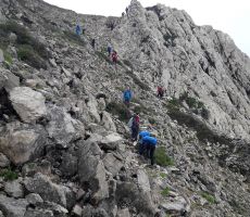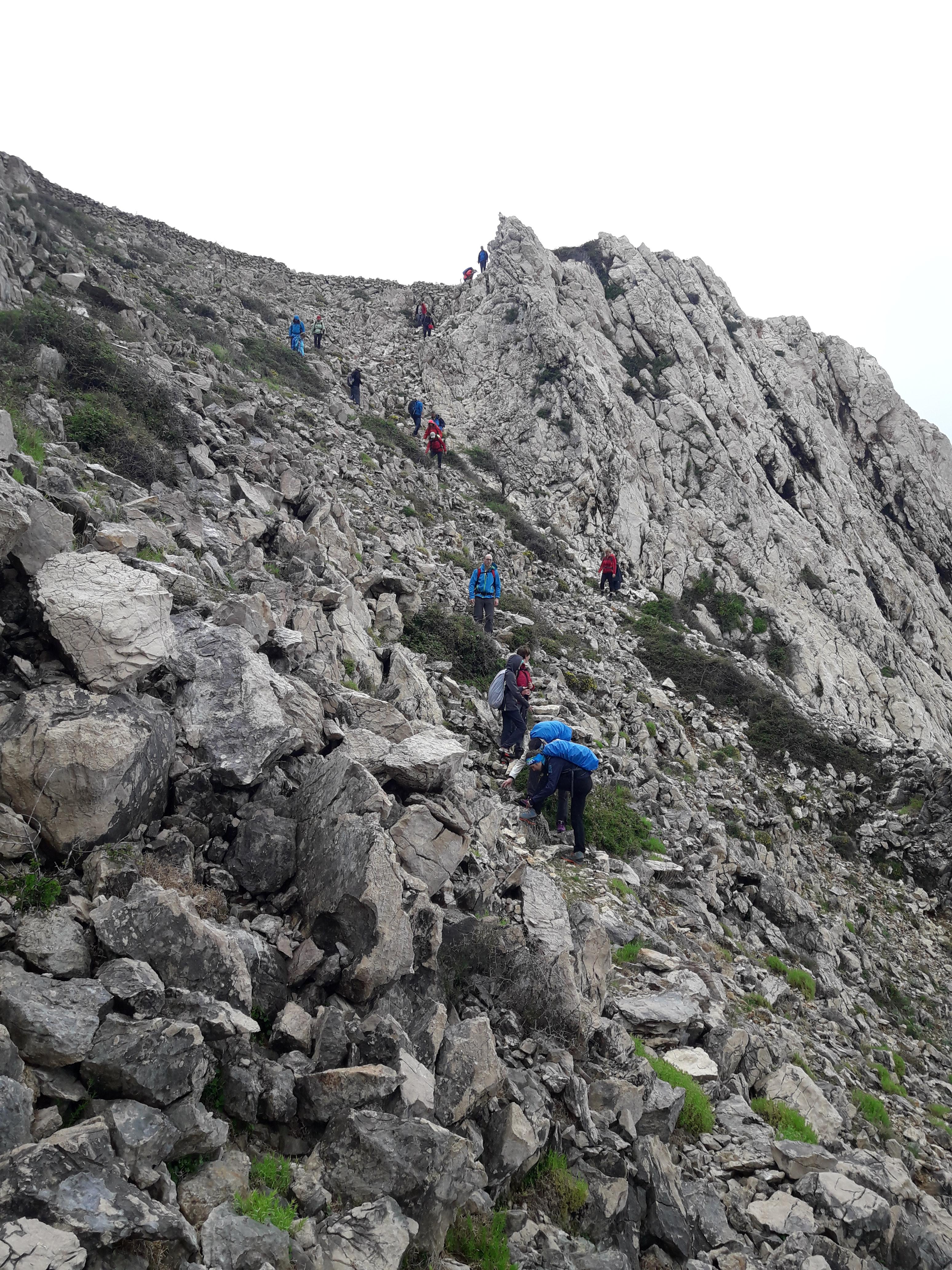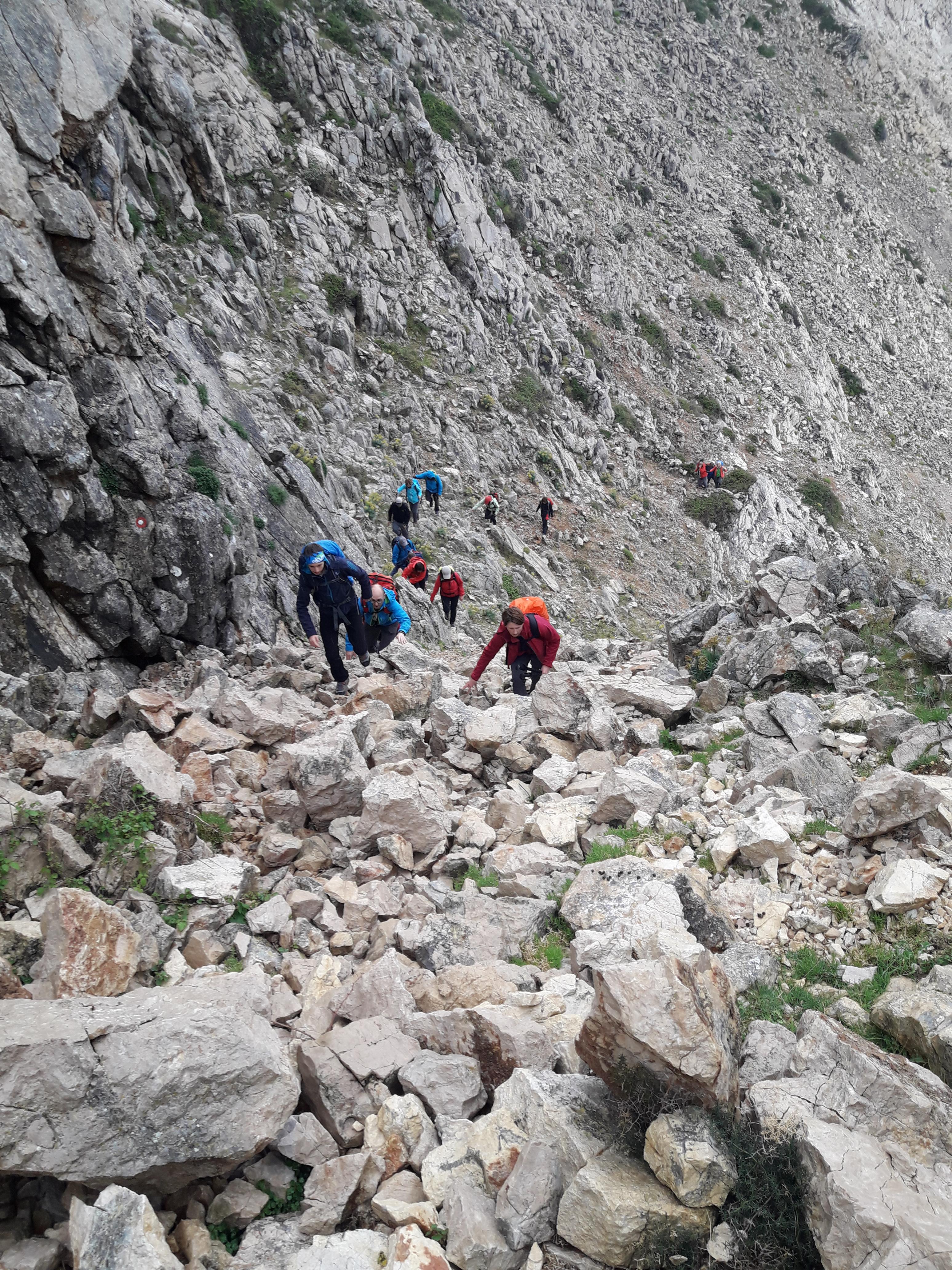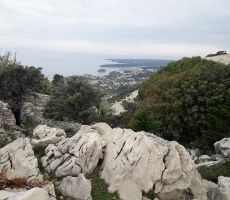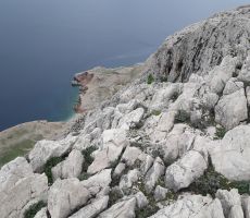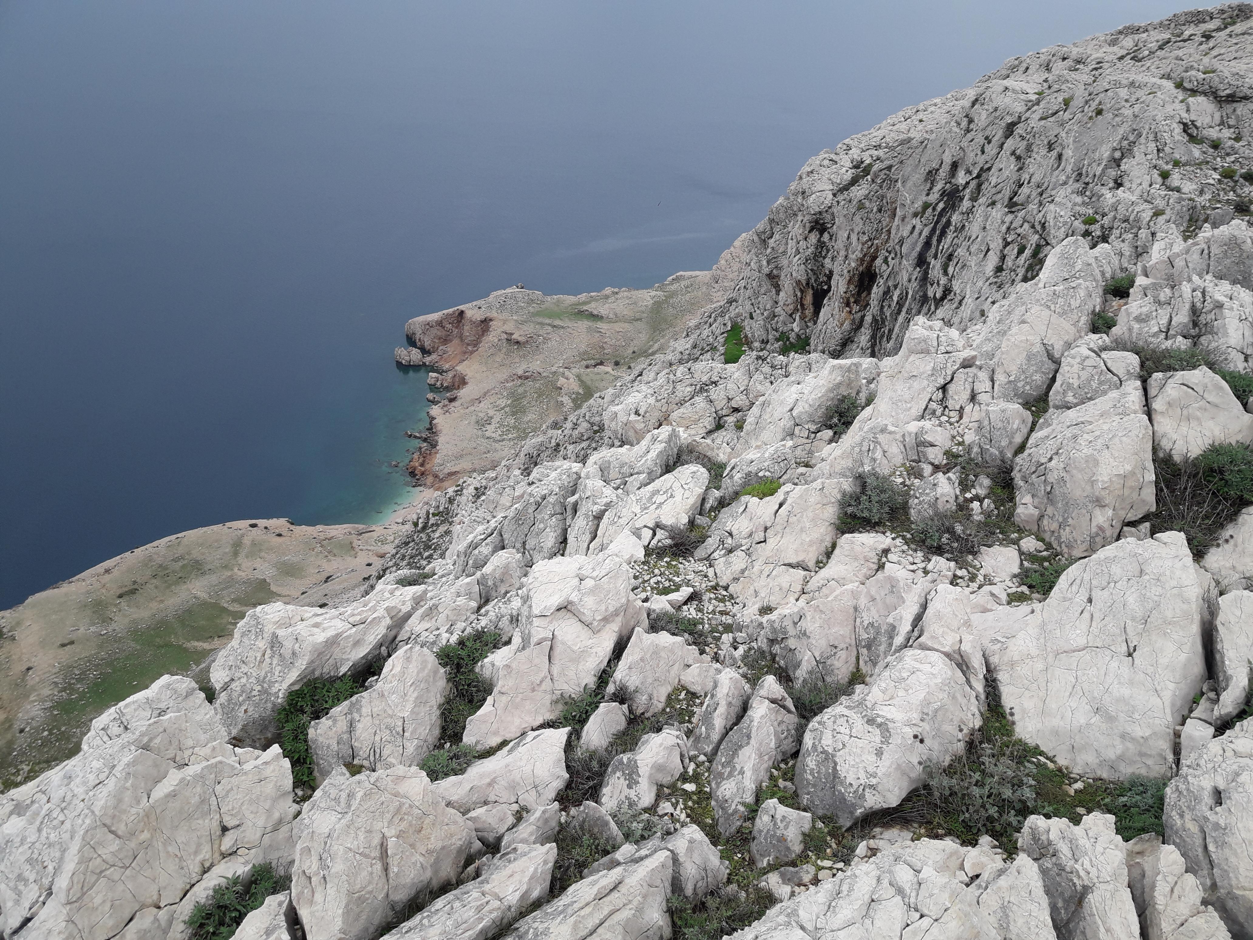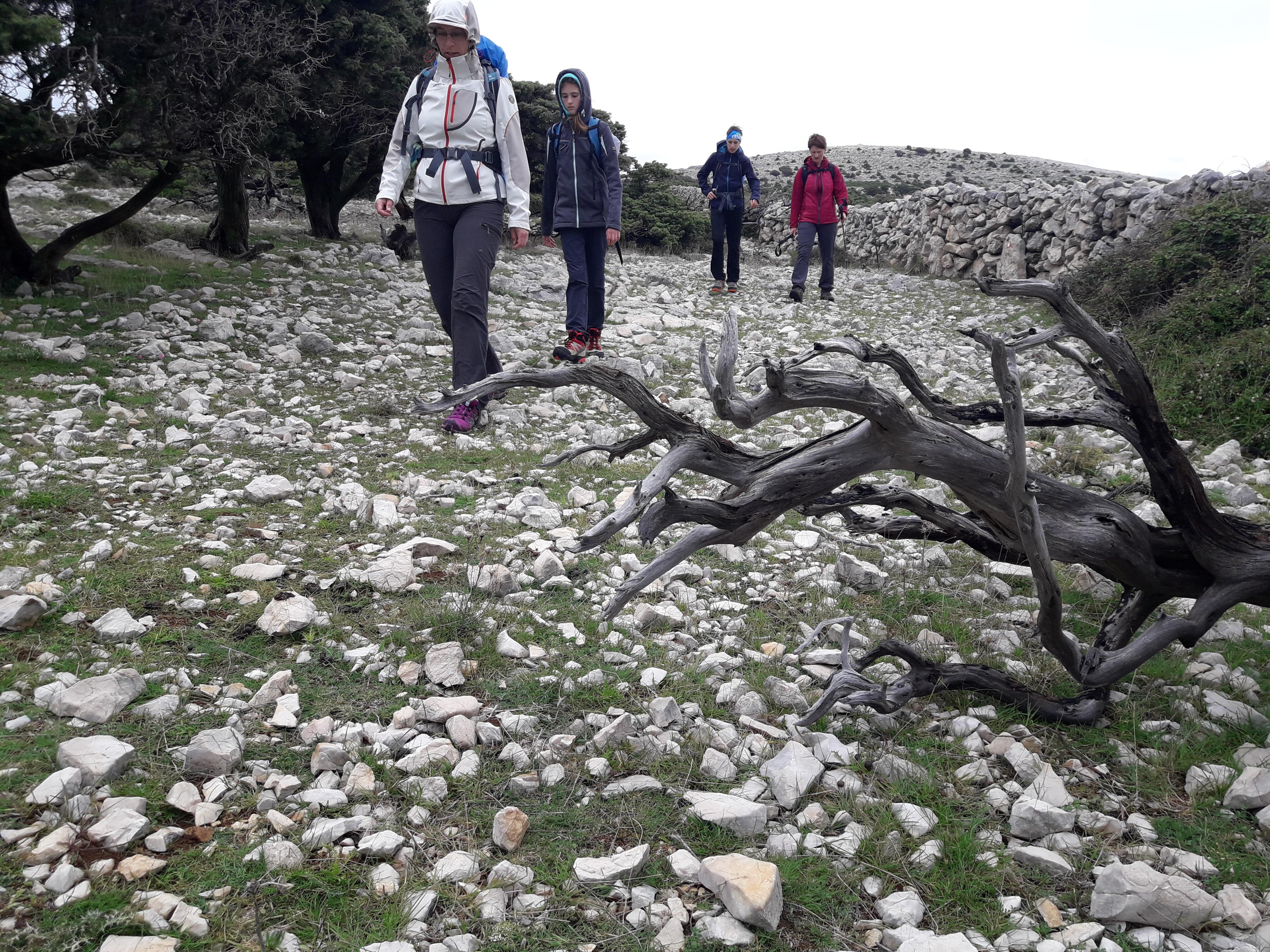 Po urici oddiha se je spet zjasnilo in smo morali naprej, saj nas je čakalo še kar nekaj ur hoje po vrhu levega strmega grebena. Uživali smo v lepih razgledih na otok Pag in visoki Velebit, ki je imel najvišje vrhove kar lepo zasnežene. Moram reči, da bila hoja po vrhu grebena kar malce bolj razgibana zaradi ostrega kamenja in spustov ter vzponov po eni od sotesk. Klub blagim naporom smo v lepem ritmu hoje doživeli tisto, kar si vsak planinec želi.
