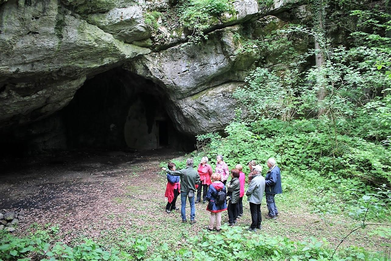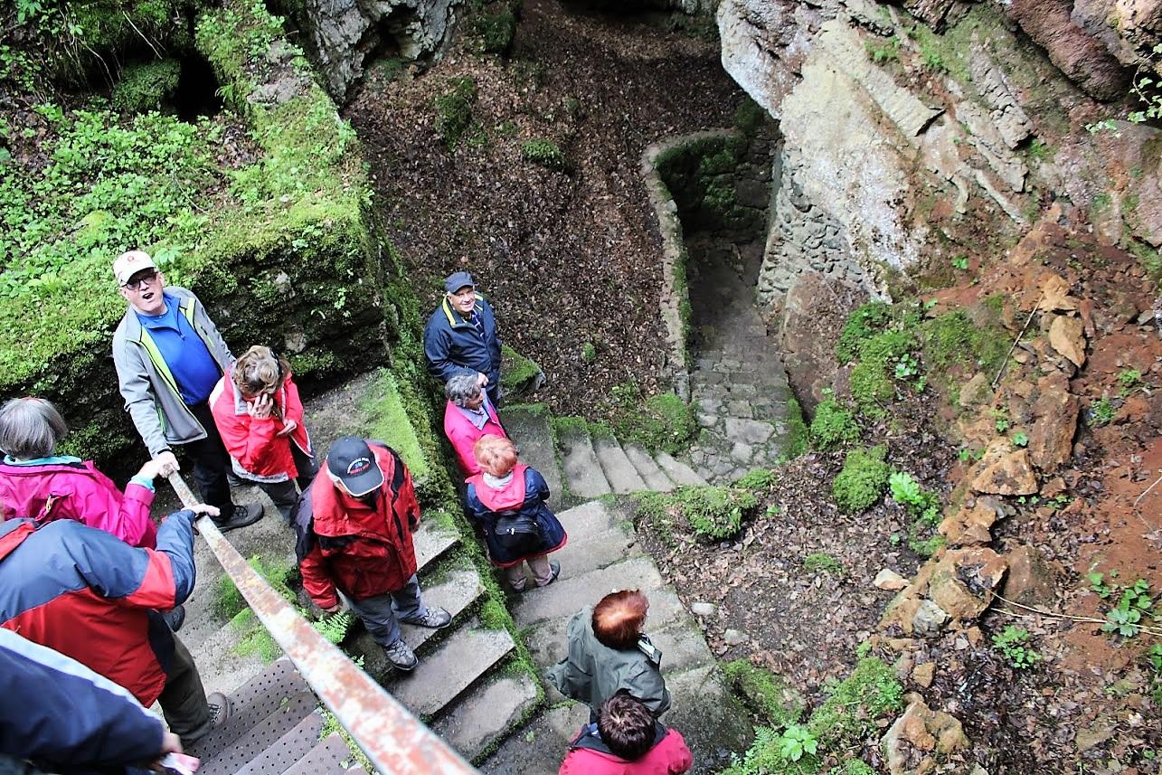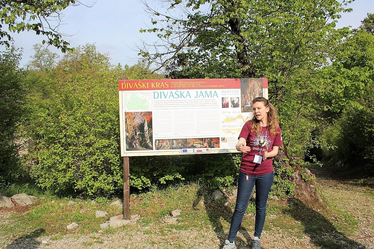 Zaradi festivala KRAŠKA GMAJNA, ki bo potekal do 25. maja letos in zaradi slovesnosti v Parku Škocjanskih jam, smo morali spremeniti predvideni potek izleta na območju Divače. Najprej, tj. že ob 9 uri zjutraj nam je vodstvo Jamarskega društva, imenovanega po domačinu Gregorju Žiberni, omogočilo ogled prečudovite Divaške jame, odkrite že leta 1884. Z množico udornih dolin in brezen v okolici Divače je del nekdaj aktivnega jamskega sistema, ki ga je na tem območju oblikovala Reka, ki nedaleč stran ponika v znamenite Škocjanske jame. Z zanimanjem smo si ogledali izredno zanimivo kapniško bogastvo pisanih stalagmitov, sveč, sigastih kop, kristalov, ki krasijo ogromno notranjost jame, nastale skozi dolgo geološko zgodovino. Po uri in pol hoje po različno osvetljenih in imenovanih predelih jame, smo zvedeli veliko o neverjetnih podzemnih krasotah v plesni in mali ter dvorani kralja Matjaža, v območju kalvarije, slonovega rilca in katakomb. Po izhodu iz jame smo se odpravili do spodmola TRHLOVCA, kjer so si ljudje postavljali tabore že v mlajši kameni dobi in, kjer so našli keramiko, kosti lovnih ter domačih živali. Nedaleč smo si ogledali še pastirsko hiško, kamnito človeško zatočišče, zahtevnejše suhozidne gradnje.