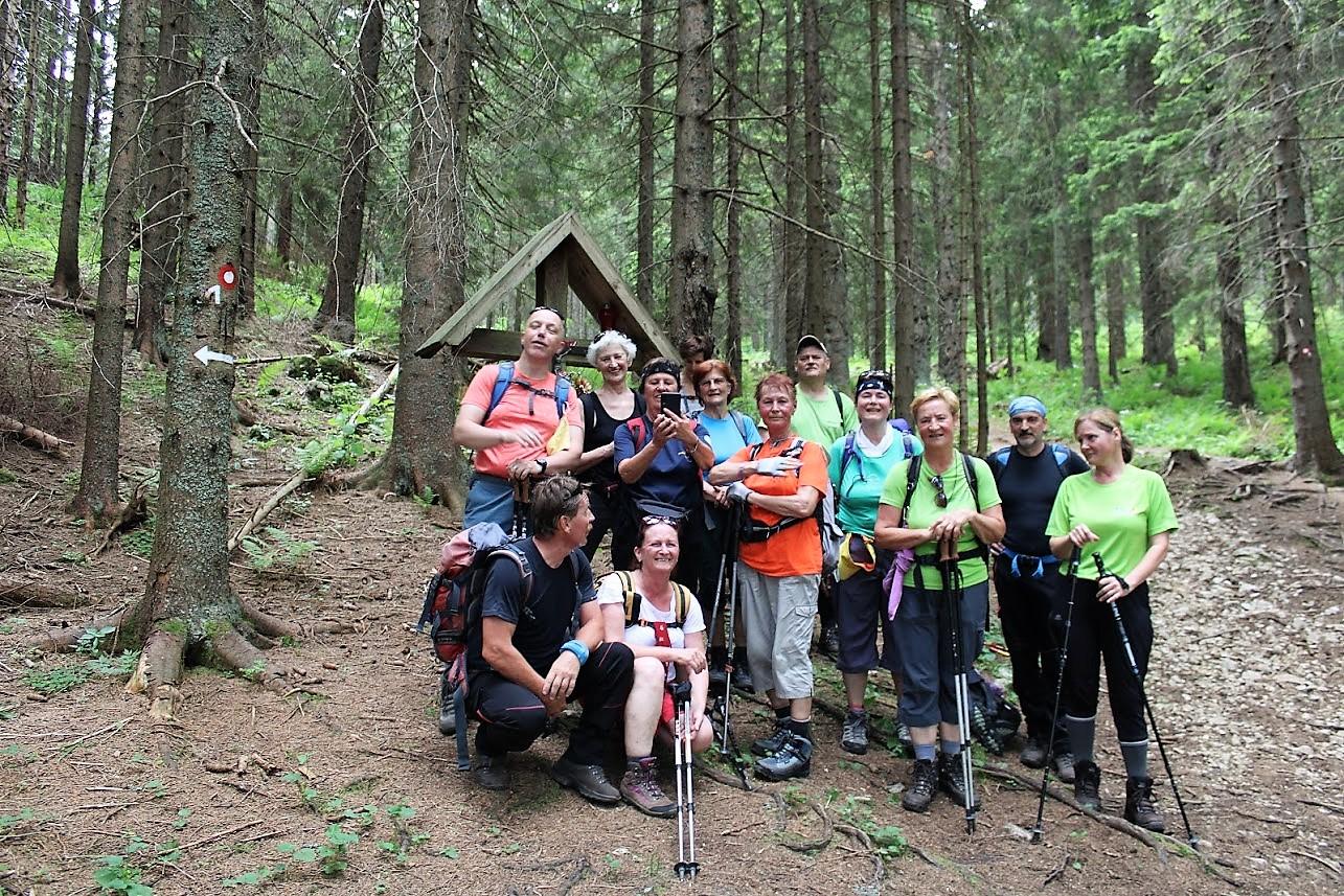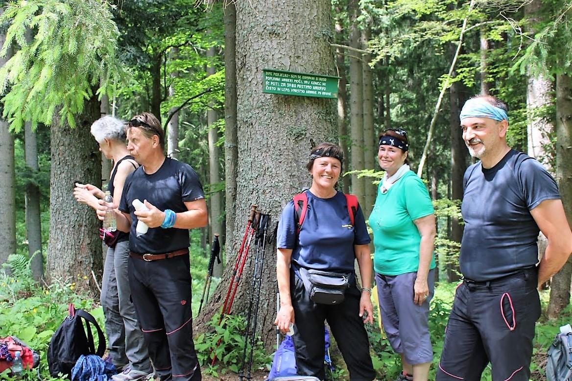 Odpeljali smo se do Kotelj, kjer sta nas pričakala Vojko kot prva violina in Janez kot druga naše poti, ki sta se nam pridružila na jutranji kavici. Skupaj smo se peljali do Ivarčkega jezera, ki je s svojimi 633 metri nadmorske višine najnižje ležeče alpsko jezero. Malo smo se razgledali, Vojko pa je v prijetni koroški šprahi navrgel lokalne zanimivosti. Nato pa pot pod noge po sprva Železarski poti do travnika Jurčka, pa nekaj minut po makadamu in zavijemo na Grofovsko pot, ki se bojda tako imenuje po grofu Turnu, če je res tu pohajal, se pa ne ve. Zdaj zagrizemo v strmino, cik-cak skozi borov gozd do zapuščene logarske bajte. Sledi kratek počitek in okrepčilo v »bifeju pod jelko«. Iz Vojkovega nahrbtnika pa krepčilna napitka, da gre lažje tja do prvega in dalje strmo do drugega križa. Se malo nadihamo in proti vrhu »Uršike« najvišjemu vrhu pogorja Plešivec in zadnjo goro v nizu Karavank. Ime Plešivec je dobila po sivem apnenčastem vrhu med gozdnatimi pobočji gore, saj iz doline izgleda kakor pleša, ime Uršlja gora pa ima po poznogotski cerkvi sv. Uršule, ki krasi njen vrh. To je najvišje ležeča cerkev v Sloveniji, edinstvena cerkev iz leta 1602, za katero so napravili načrt kar kmetje sami, saj so bili prepričani, da podokriljem sv. Uršule nikoli ne bo manjkalo kruha, mošta, dobrote, volne in prave krščanske vere. Grajena je iz apnencev in dolomitov, vmes pa so plasti skrilavcev in laporjev s prelepo skodlasto streho, notranjščina je skromna in priča o izvirni ljudski gradnji. V oltarju nas pozdravi v sredini sv. Uršula z devicami, prelep poznogotski kip, na vsaki strani jo spremljata baročna kipa sv. Petra in Pavla. Nad cerkvijo je televizijski oddajnik in planinski dom, kjer se okrepčamo z okusnimi koroškimi dobrotami kot so obara pa zravn žganki (žganci), povitneki (zavitki), Kvočevi (kločevi) nudlni (štruklji). Vse naokoli nas pa razgledi na; mežiško, mislinjsko, šaleško, dravsko dolino; Peca, Olševa, Raduha, Menina planina. Nekateri še po zaslužen žig v Dom na Uršlji gori in že se vračamo, čeprav bi se najraje ulegli na travnik posut s pogačicami, ki so prava paša za oči, pa kaj, ko je treba dalje do jelenovega pašnika, kjer se je menda Uršuli noga vdrla v skalo in še dandanes je v skali luknja v obliki njene noge. Legenda priča, da kdor stopi vanjo, ne bo več čutil bolečin v nogah (škoda k je samo legenda). Pa se poraja vprašanje, kako bi nogo spravil v luknjo? Saj gre, se pa tudi pripeti, da potem ven le ne gre prav zlahka. Pa tudi edina legenda o Uršiki ni: saj so Štajerci trdili, da je prišla na goro po njihovi strani, saj se pri njih vidijo odtisi klečanja sv. Uršule na skali. Korošci pa so trdili, da je prišla po njihovi strani, saj je bila na tem mestu skala tako mehka, da se ji je noga ugreznila vanj; le kdo bi vedel kaj bolj drži. Mi pa dalje, ena skupinica z Vojkom čez drn in strm po breg; druga pa z Janezom po bolj lagodni poti v isto smer, vmes še postanek pri idilični hiški, dalje do izvira, kjer se prileže požirek bistre vode in dalje do do Luž in Naravskih ledin. Od tu z avtobusom nazaj v Kotlje še na pokušino Kotuljske kiseve vode, kot so ji včasih rekli domačini in je bila znana kot namizna mineralna voda v restavracijah v Celovcu, Gradcu in Dunaju, kjer so prodajali celo v lekarnah. Pravijo, da jo je pil tudi sam Franc Jožef in je le zato tako zdrav in čil kljuboval visoki starost Sedaj pa je ostala Kotuljska slatina, tako značilnega okusa in vonja, ki smo jo z veseljem poskusili in nekateri tudi domov prinesli. Tudi stavba Rimski vrelec nasproti izvira, kjer je bilo v 19. stoletju celo letovišče s kopališčem, sedaj kljubuje le še zobu časa.