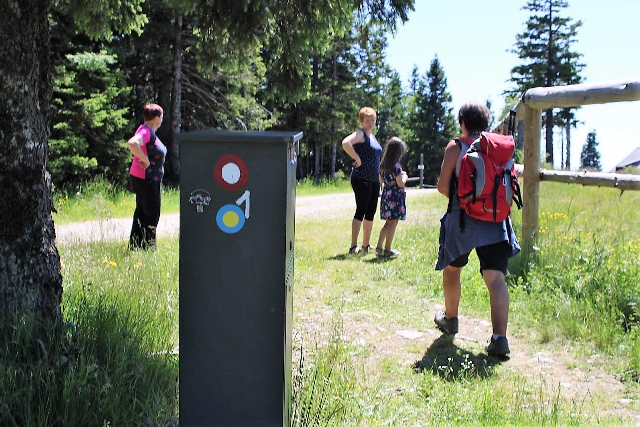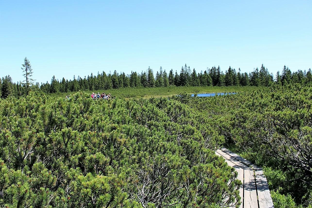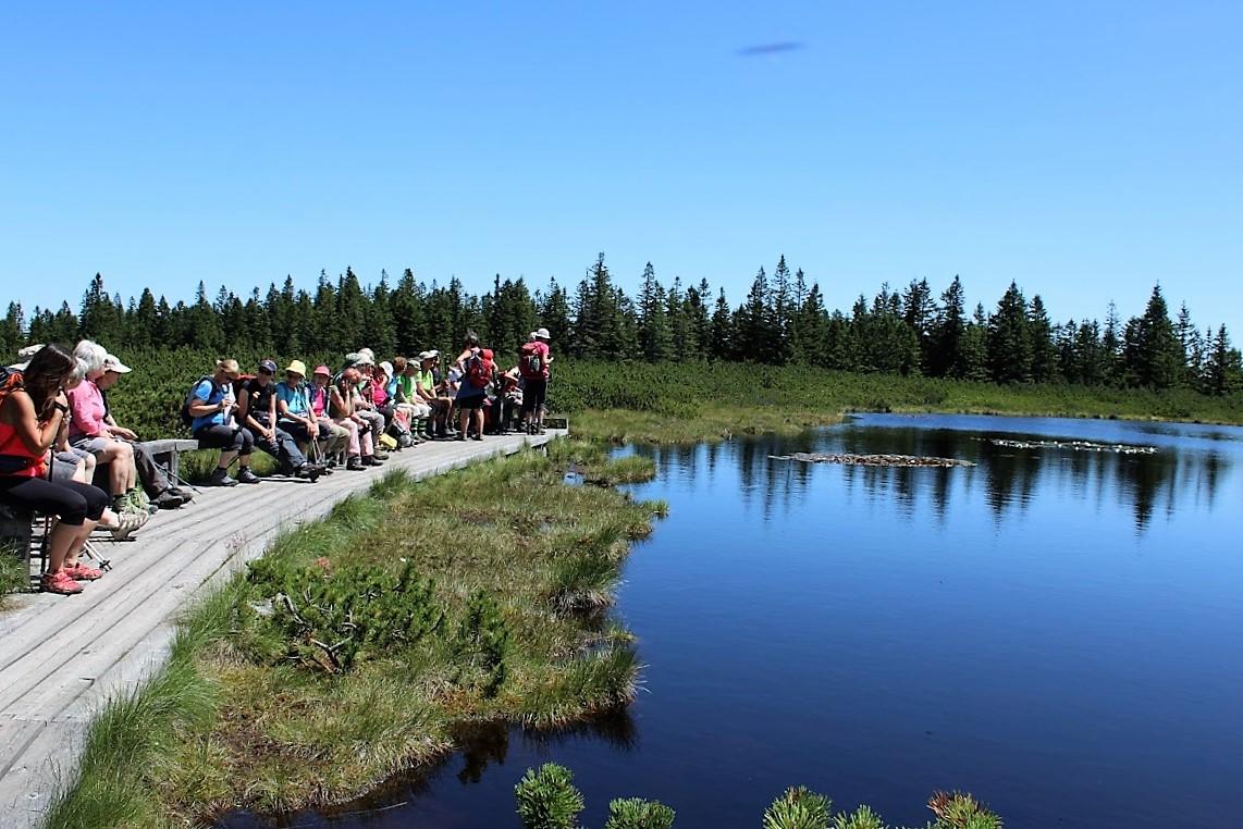 Iz Legna smo se po ovinkasti gorski cesti odpeljali do Grmovškovega doma. Po krajšem počitku za jutranje napitke smo se odpravili proti ribniškemu predelu Pohorja. Najprej na ČRNI VRH (1543m), najvišji vrh pogorja, do katerega smo hodili dobro uro. Po krajšem počitku za nekaj posnetkov, žige, vpise in občudovanje s smrekovo skorjo prekritega bivaka, smo nadaljevali s hojo do Ribniškega oziroma JEZERSKEGA VRHA (1537m), odtod pa še do šotnega barja s prelestno modrim in s cvetočimi lokvanji in ruševjem bogatega Ribniškega jezera (1490m).Vsem ki so tudi člani Društva Poti kurirjev in vezistov NOV sem prebrala pesem Ribniško jezero,ki ga je napisal Stanko Hovnik iz Pameč-kurir NOB-ob 50.obletnici delovanja vojaških kurirskih postaj,objavljeno v knjigi Partizanski kurirji in pesmi.Vse kar nam je avtor podal v pesmi je resnično,Jezero je res čudovito,čarobno in kačji pastirji,ki naj bi se družili z lastovicami,ki krožijo v nizkem letu,so nas tudi obletavali,da smo jih lahko iskreno občudovali.
