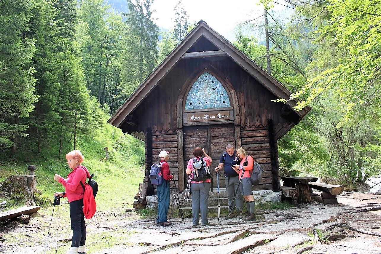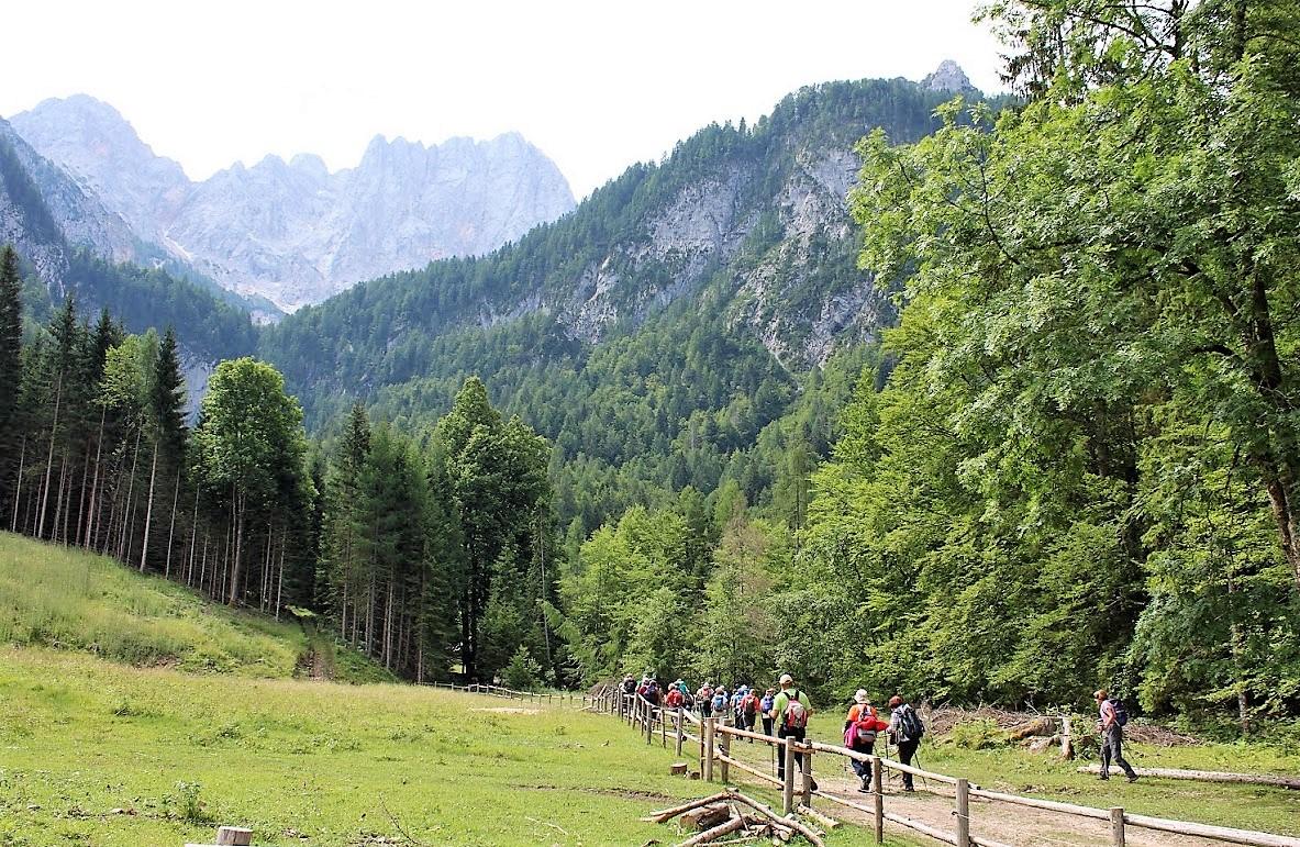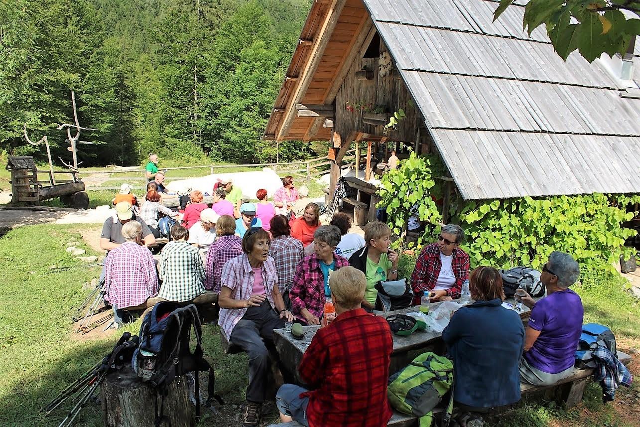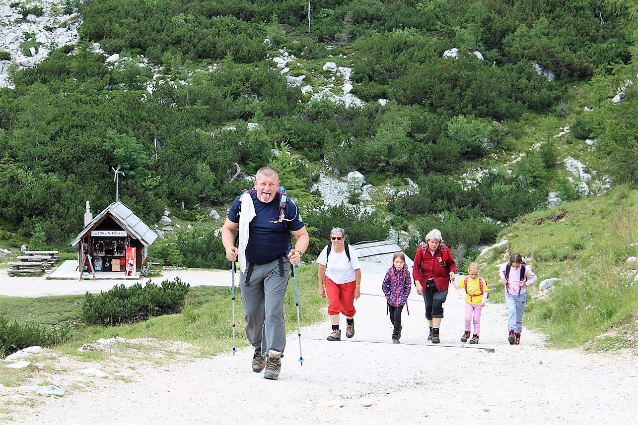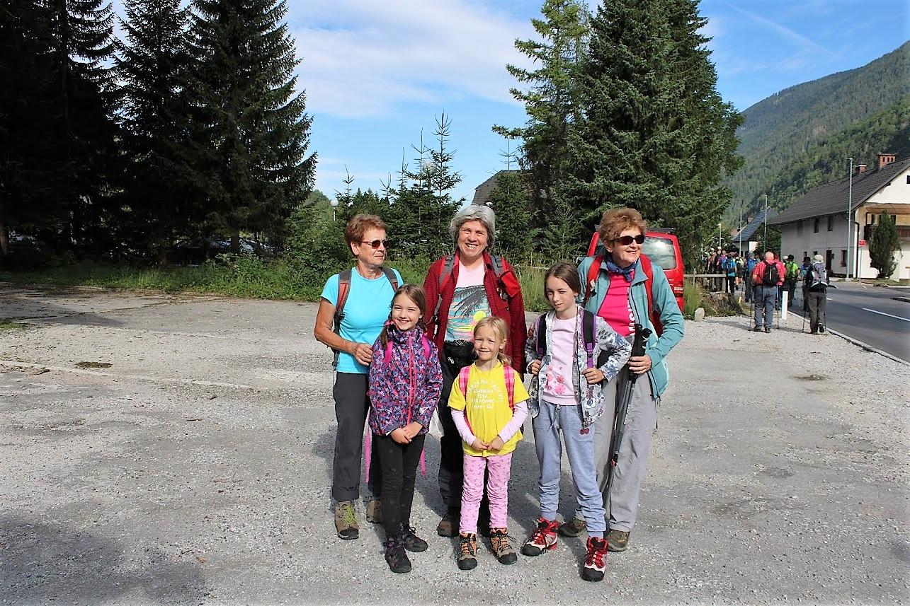 Koča pri Ingotu – Jasna – Poštarski dom (11. julij 2019) V pretežno vremensko nikakršnem tednu je Borisu tudi tokrat uspelo izbrati dan, ki je bil primeren za planinski izlet. Še več kot to, dan je bil, vsaj dopoldan, sončen. Popoldan je bil sicer delno oblačen toda brez dežja, ki bi kvarilo vzdušje med pohodniki. In tudi samo število udeležencev je bilo nad povprečjem. Zbralo se nas je 45 pohodnikov, ki bi jih bilo še več, če ne bi bila smola na delu. Bile pa so z nami tri mlade deklice. To so bile Pia, Veronika in Dominika. Pripeljala jih je planinka babi, da bi jih počasi navdušila za lepote planinstva. Najmlajša med njimi je bila premajhna za naporno hojo, ki je nekajkrat potekala na bolj izpostavljenih mestih. Slavka Lazar se je prijazno ponudila, da prevzame vodenje treh otrok in njihove babice. Tako se je šest deklet na samem izhodišču ločilo od jedra skupine in odšlo po lahki poti mimo Martuljka v smeri Kranjske gore. Preostali so nadaljevali pot po bolj zahtevni, sicer še vedno uradno, turistični poti. Pot je dobro zavarovana, toda na nekaterih mestih so bili kar visoki stopi, ki bi za otroke bili prenaporni. Za odrasle planince niso predstavljali izziva, je pa bila potrebna pozornost in zbranost. Ob zmernem tempu, ki ga je narekoval naš vodnik Boris Lazar, smo hitro prišli do gozdne ceste. Nenadoma je pripeljal mimo velik delovni stroj za prevoz debel iz gozda. Za njim je ostala prazna cesta, po kateri smo v slabe pol ure prispeli do Koče pri Ingotu. Kratek postanek za kavo in malico iz nahrbtnika, skupinsko slikanje in že smo bili na poti. Usmerili smo se proti jezeru Jasna. Skupina se je po dobre pol ure hoje ponovno delila. Tokrat se je odcepila skupinica petih planincev, ki so se vrnili proti izhodišču, kjer je še vedno čakal avtobus. Večji del skupine je Danilo Cej odpeljal skozi gozd po poti, ki je pozimi sankaška proga. Skupina je složno hodila in smo dokaj hitro prispeli do Tofovega grabna. Spust po strmem pobočju je minil brez težav in kar nenadoma smo bili med prvimi hišami. Nekaj minut postanka so nekateri izkoristili za fotografiranje, drugi so počakali kar na avtobusnem postajališču. Avtobus nas je zapeljal na prelaz, kjer je bilo bistveno bolj hladno. Ni bila potrebna nikakršna dodatna spodbuda za vzpon do Poštarskem doma. Tam nas je pričakala okusna enolončnica in sladica. Po kratkem postanku v domu so se eni spustili do avtobusa, drugi so se odpravili proti Erjavčevi koči. Ker pa je Jožef zavil proti t.i. Titovi koči, so se pohodniki in avtobus srečali na pol poti med prelazom in Erjavčevo kočo. Tako je bilo hoje za nekatere premalo, za druge pa skoraj prava mera. Zapisal: Jožef Tišlarič Fotografije: Danilo Cej