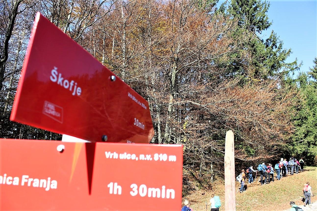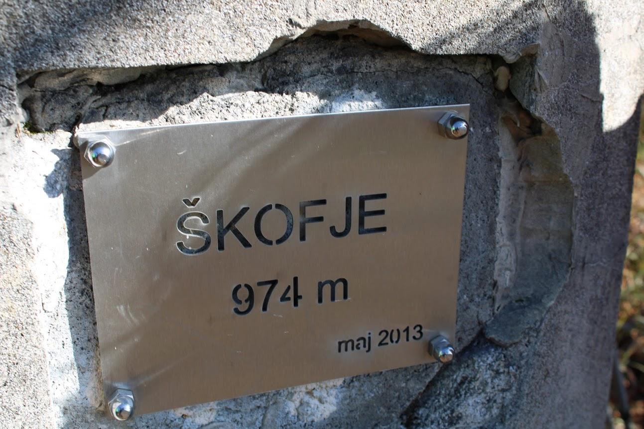 S sedla smo se po gozdni stezi povzpeli do razgledne točke na obrobju Škofja, od tam pa smo se povzpeli po travnatemu grebenu do najvišje točke, kjer nas je pričakala četverica naših planincev, ki si je za osvojitev vrha izbrala lažjo varianto s Kladja. Po pripovedovanju je Škofje dobilo ime po freisinških škofih, ki so zahajali sem gor. Na Škofju je bil sneman tudi zaključni prizor slovenskega filma Dolina miru.