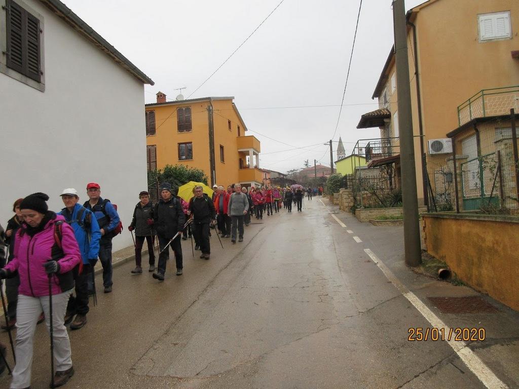 V soboto, 25, januarja 2020, se nas je za tokratni pohod, po trasi hrvaškega zadnjega predela poti PARENZANA ali POREČANKA (Istranka), po nekdanji trasi železniške proge po Istri, že na počivališču Lom zbralo okrog 300 pohodnikov. Naših udeležencev je bilo 36. Na mejnem prehodu nismo imeli nobenih problemov, policisti so registrirali le število prijavljenih oseb v avtobusih. Med vožnjo smo se malce poglobili v zgodovino in druge pomembne zapise o nastanku in delovanju nekoč gospodarsko tako zelo pomembne proge, zdaj posvečene le pohodnikom, kolesarjem in vsem tistim, ki jim je mar, kako je nekoč deloval železniški promet tudi po prelepi Istri. Ugotovili smo naslednja pomembna tehnična dejstva: Ozkotirna železniška proga (širine 760 mm ) med Trstom in Porečem je obratovala med l. 1902 in 1935, tj. 33 let, potem pa so jo Italijani, zaradi nenehnih izgub. ukinili. Dolžina proge je znašala 123 km, skupnih postaj in postajališč je bilo 35 najnižja in najvišja točka nadmorske višine je znašala 2 m in 293 m (v predoru Kalcini), krivin je bilo 604, največji naklon 28 %0. Vlak je moral prevoziti 9 predorov v skupni dolžini 1530 m, prek11 mostov ( Osapske reke, Rižane, Dragonje in Mirne). Viaduktov je bilo 6, zavojev 604. Poprečna hitrost je znašala 25 km/h, najvišja 31 km/h. Dolžina vagonov je znašala 8,5 m, vožnja od Trsta do Poreča pa je trajala od 6-7 ur. Ob 100-obletnici otvoritve proge so pristojni sprejeli pobudo, da traso obnovijo in spet oživijo povezovanje ljudi na tem področju. Zdaj je pot imenovana tudi Pot zdravja in prijateljstva, vedo bolj je priljubljena, ugodna je predvsem za tiste, ki imajo radi ravninske pohode. Pot je primerna za hojo v vseh letnih časih. Poteka mimo njiv, oljčnih nasadov, vinogradov, gozdov, redkih naselij. Pot je zelo razgledna, zlasti naš slovenski predel s solinami, Portorožem idr. lepimi obmorskimi predeli.