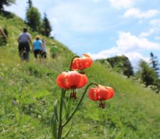 Na Vrh Bače, k lovski koči, za katero skrbi LD Podbrdo smo prispeli ravno v času zgodnjega kosila. Privoščili smo si daljši počitek in uživali v razgledih na Baško grapo in na sosednje gore. Tu so tudi še vidni ostanki Rapalske meje, saj je nad kočo v skalah še vedno zelo dobro ohranjen bunker, na poti proti Petrovemu Brdu pa je delno razpadajoči vojaški objekt »kasarna«. Sprehodili smo se še do razgledne točke, ljubitelji gorskega cvetja pa so v svoje fotoaparate lovili neštete kranjske lilije in ostalo cvetje, ki je bilo v polnem razcvetu. Pred nami je bil še sestop na Bačo pri Podbrdu. In naprej v Podbrdo. Prvih nekaj metrov je bilo dokaj strmih, ker pod vrhov ni več ohranjena stara vojaška pot »mulatjera«. Še dodatno pa je bila steza v slabem stanju, ker so teden prej tu tekli gorski tekači na maratonu 4 občin in na 103 km ultra maratonu, ki je potekal od Podbrda, Lajnarja, Slatnika, Stržišč, Hudajužne, Porezna, Blegoša do Ratitovca in prek Soriške planine nazaj v Podbrdo. ( http://www.gm.4o.si) Velik del poti nas je peljal po gozdu in nismo občutili prehude vročine, čeprav nas je lepo speljana »mulatjera« v ključih peljala v dolino. Naslednji postanek smo si privoščili na Bači, kjer smo si ogledali pomnik hribovski materi, delo domačinke, umetnice Stanke Golob, ki že vrsto let ustvarja slike iz naravnega peska. Ob sliki je verz pesnitve domačinke Marjuče. Pridružil se nam je še Cveto Zgaga, izseljeni domačin, katerega velika zasluga je, da se v Baški grapi ohranjajo vrednote iz preteklosti. Odpravili smo se še v cerkev sv. Lenarta v kateri nam je Cveto povedal njeno zgodovino, ki sega dobrih 500 let nazaj. Več o poselitvi in zgodovini teh krajev si lahko preberete v spodnjih povezavah: