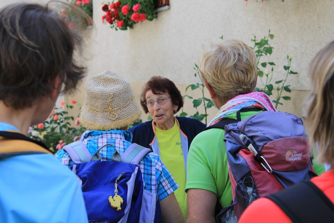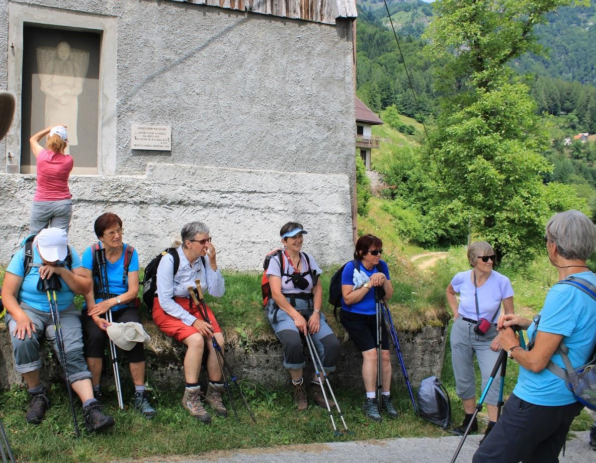 Pred nami je bil samo še spust po gozdni cesti do Podbrda, kjer je že čakal avtobus, da odpelje naše planince nazaj proti Ljubljani. Današnji dan je bil poln nenačrtovanih vmesnih dogodkov. Ne da bi se prej kaj dogovarjali, smo pod Cvetovim vodstvom natančneje spoznali vas Bačo, ko pa smo prišli v Podbrdo, smo se po naključju srečali še z avtorico pesmi, ki je posvečena hribovskim materam. Marjuča Volf se je razveselila srečanja z nami, saj je bilo v skupni tudi par domačink, s katerimi se je poznala še iz časov, ko so bile zaposlene v tekstilni tovarni Bača Podbrdo. Zato se je brez oklevanja odločila in nam povedala celotno pesem posvečeno hribovskim materam, ki se je vseh nas, ki poznamo težko življenje v teh hribih dotaknila.