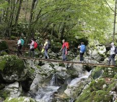 Kratek čas nas je pot vodila po asfaltirani cesti. Nato smo zavili na makadam in nadaljevali preko ozkega visečega mostu. Čista voda Lepence in temnozeleni tolmuni so bili občudovanja vredni. Nismo se ustavljali, saj nas je naš lokalni vodnik odločno vabil naprej na jaso in dalje v gozd ter navzgor, na levem bregu Lepence. Večkrat smo se ustavljali in slikali, saj so slapiči in slapovi bili enostavno prelepi, da jih ne bi ovekovečili na fotografiji ali za na FB ali svoj osebni album. Voda v potoku Lepence se napaja iz potoka Šumnik, ki od izvira do izliva premaguje samo 500 m višinske razlike. Potok Šumnik je je eden najbolj skrivnostnih predelov Slovenije. Izvira izpod planin od Debeljaka (1869 m) do Oblega brda (1957 m). V bližini je bil leta 1998 na veliko noč epicenter močnega potresa. Potok Šumnik v svojem toku ustvarja veliko število slapov s čudovitimi tolmuni. Le ti tudi ob največji suši ne presahnejo in imajo vedno obilico vode.