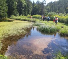 Po nekaj deset metrih smo se ustavili pri mokrišču (povirno barje pri Plešivškem mlinu) kjer se združujejo potočki iz bližnjih dolinic, obdanih z gozdovi. Tu imajo svoje domovanje številne rastline in živali, tudi vse bolj redek metulj, sviščev modrin. Ob mlinu je drevored divjega kostanja na nadmorski višini 860 m, kar je vsekakor prava posebnost v Sloveniji. Nadalje nas je pot peljala mimo Plešiviškega dvora, kjer so vidni le sledovi temeljev nekdaj največje in najlepše kmečke domačije svobodnjakov na pobočjih Uršlje gore.