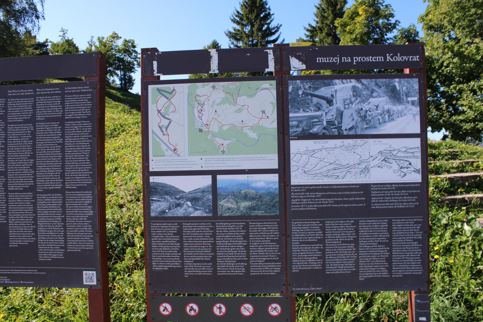 V času prve svetovne vojne je italijanska vojska na Kolovratu zgradila sistem obrambne črte, katere del je danes preurejen v muzej na prostem. Greben je prepreden s strelskimi jarki, kavernami in poveljniškimi ter opazovalnimi mesti. Ob prihodu v muzej, nas je pričakal lokalni vodnik, ki nam je podrobno razložil načine gradnje obrambnega sistema, sam način bojevanja in predvsem nezavidljivo življenje vojakov na bojiščih soške fronte. Muzej je zanimiv zaradi različnih podrobnosti, kot so ozki prehodi, vdelani originalni materiali, ki so bili uporabljeni v vojni. Posebnost muzeja je, da je v dveh državah hkrati – Sloveniji in Italiji.