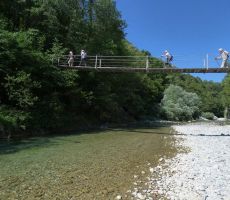 Po brvi se vrnemo na pot proti Podbeli. Srečujemo tabornike, malo pokramljamo z njimi. Našo pot sekajo številne kolesarske steze, srečujemo gorske kolesarje. Sem ter tja tudi kakšnega sprehajalca. Če zaslišimo kak živžav, stopimo skozi grmovje do reke, vidimo tolmune, v katerih uživajo kopalci. Vendar pa je pogled na reko na mestih, kjer ni tolmunov, dokaj žalosten. Pomanjkanje dežja pomeni tudi pomanjkanje vode, korito je napol suho, pretok majhen.