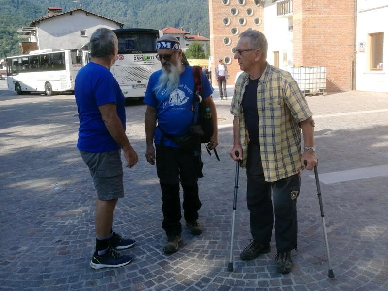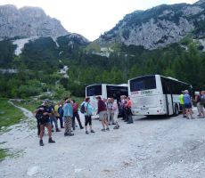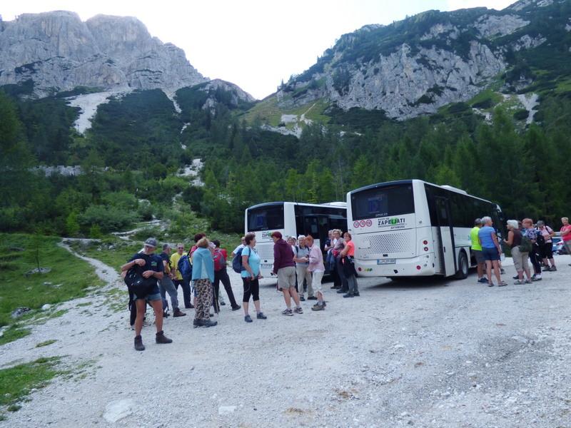 Pri odhodu smo imeli nekaj zamude zaradi prevoza. Nabralo se nas je za poln avtobus, ki pa bi imel zaradi velikosti problem pri vožnji čez Vršič. Počakali smo, da so nam dostavili dva manjša avtobusa, se razdelili v dve skupini in se mimo Nove Gorice zapeljali po dolini Soče do Kobarida. Pridružil se nam je lokalni vodnik Joško Kodrmac, popili smo jutranje kavice in se odpeljali do parkirišča v bližini vasi Kred.