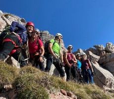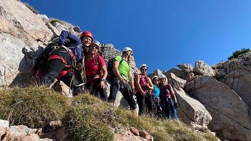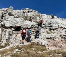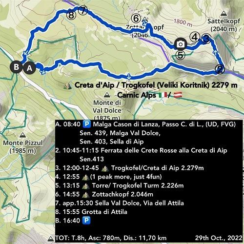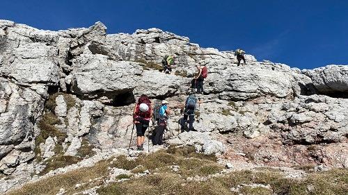 Na parkirišču smo imeli še nekaj družbe, ki pa se je odpravila proti Monte Zermula. Za gostiščem smo krenili po poti 439, ki sprva poteka po ravnem makadamu, nato pa se steza preko precej vodnatega terena povzpne nad planino Malga di Val Dolce in se priključi na prečno pot 403, ki vodi proti vzhodu do sedla Velikega Koritnika. Malo pred sedlom smo našli oznake za Ferrato Crete Rosse. To je kratka, lepo speljana ferata, kjer smo se povzpeli za 200 m po naravnih razčlembah. Po vršnem delu gore, pravzaprav razdrapani planoti, smo krenili do velikega križa na vrhu, kjer smo se slikali.