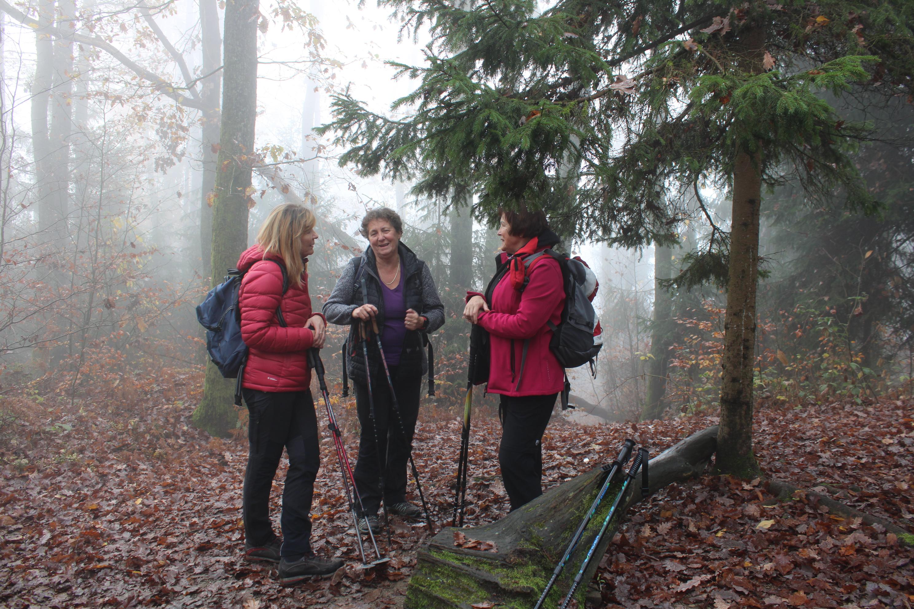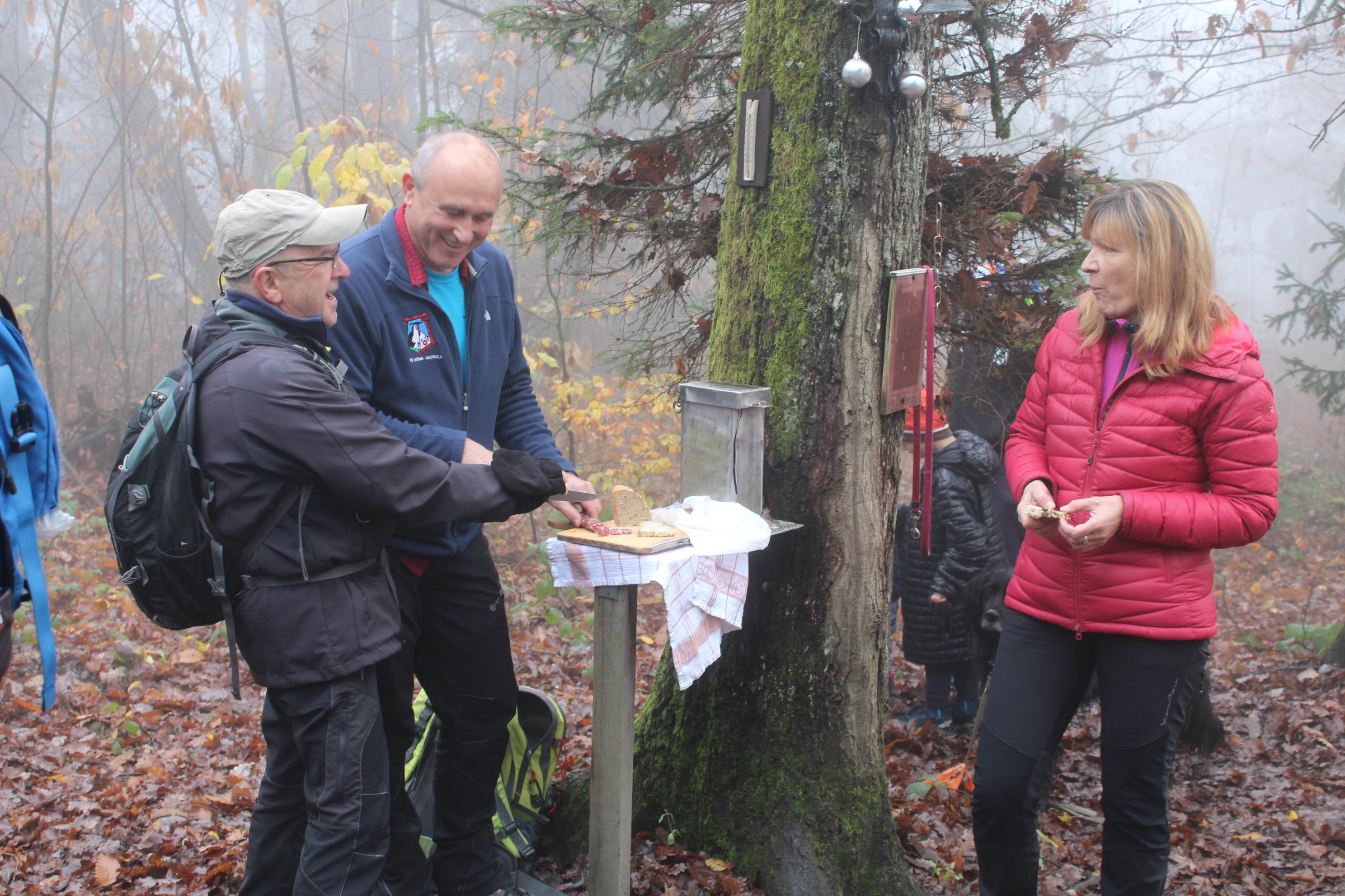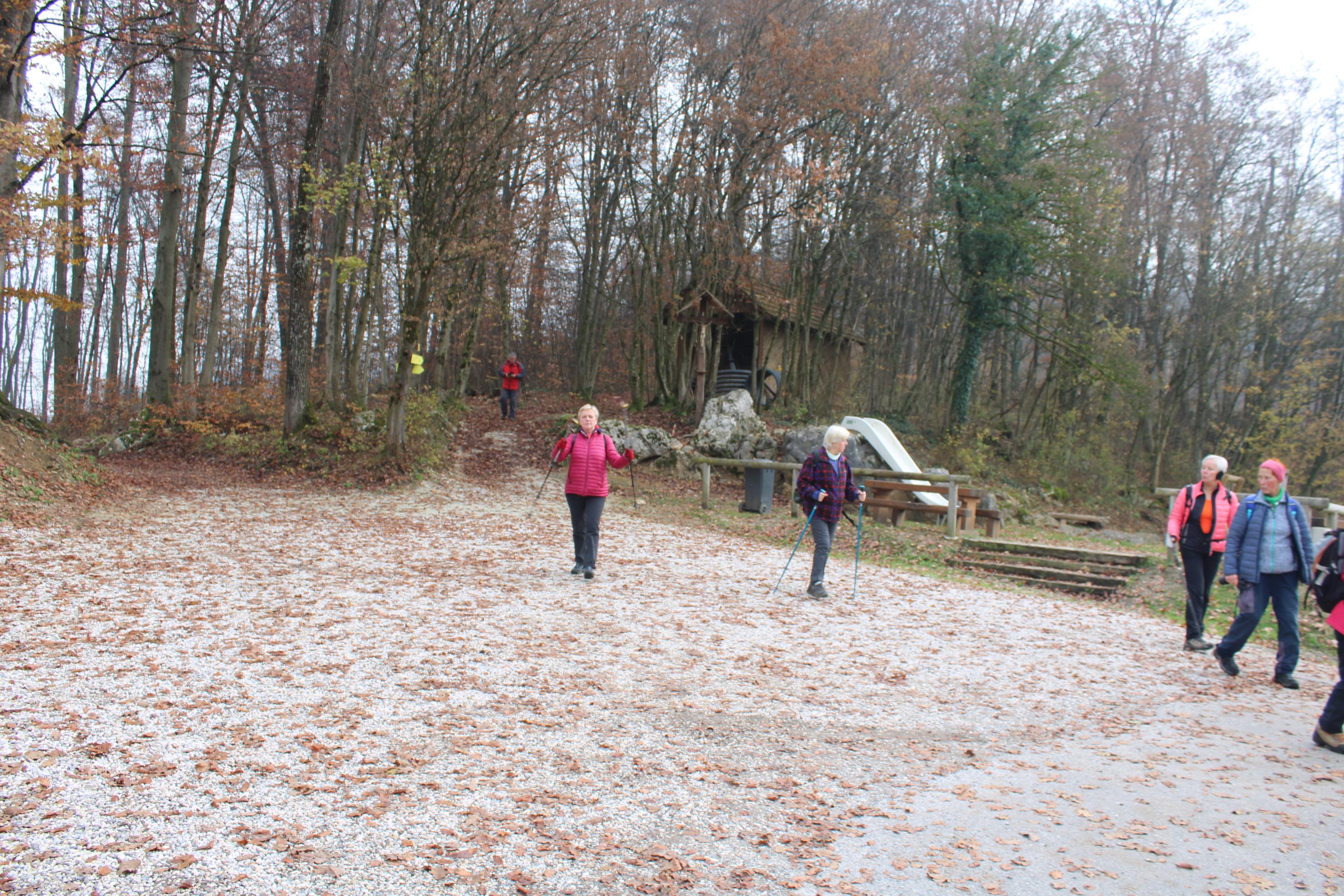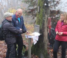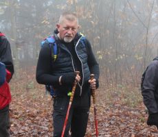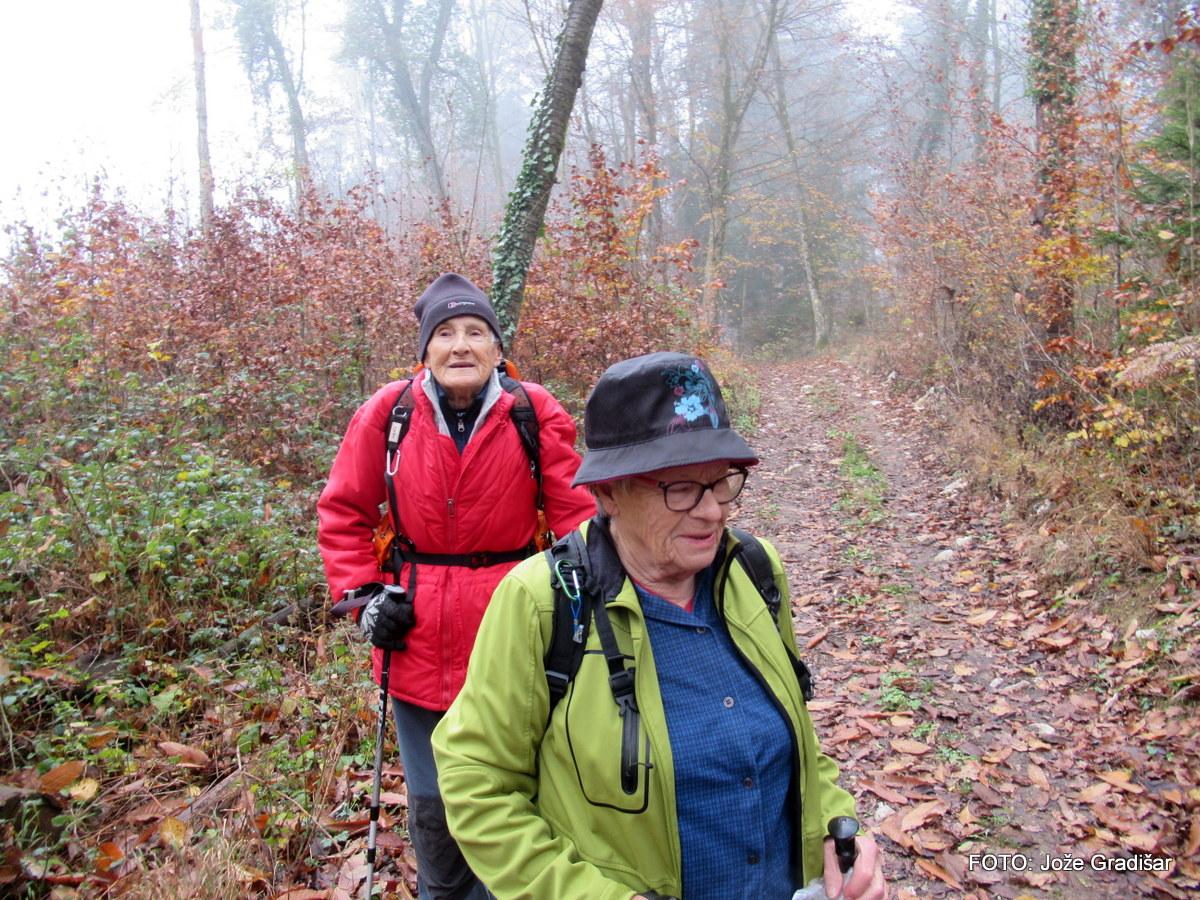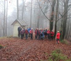 Ostali člani smo svoj pohod na hrib Ajdovščina pričeli v Zaborštu. Sprva je bila pot malo bolj strma, meglena, vendar vseeno zanimiva, saj so kljub novembru ob poti še vztrajale gobice, zadnje letošnje cvetlice in še nekateri zlato obarvani listavci. Kaj kmalu se je pot položila in postala lahka pohodna pot. Vodila nas je mimo obeležij NOB, del poti pa tudi po Poti revolucionarnih tradicij. Do vrha Ajdovščine, ki meri v višino borih 465 m smo prispeli v slabih štiridesetih minutah. Pot, do z gozdom poraščenega vrha, je vseskozi potekala v mešanem gozdu, obdanemu z meglo, ki pa v dobri družbi ni predstavljala nikakršne ovire.
