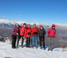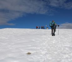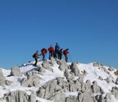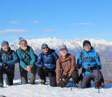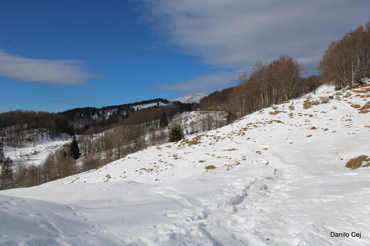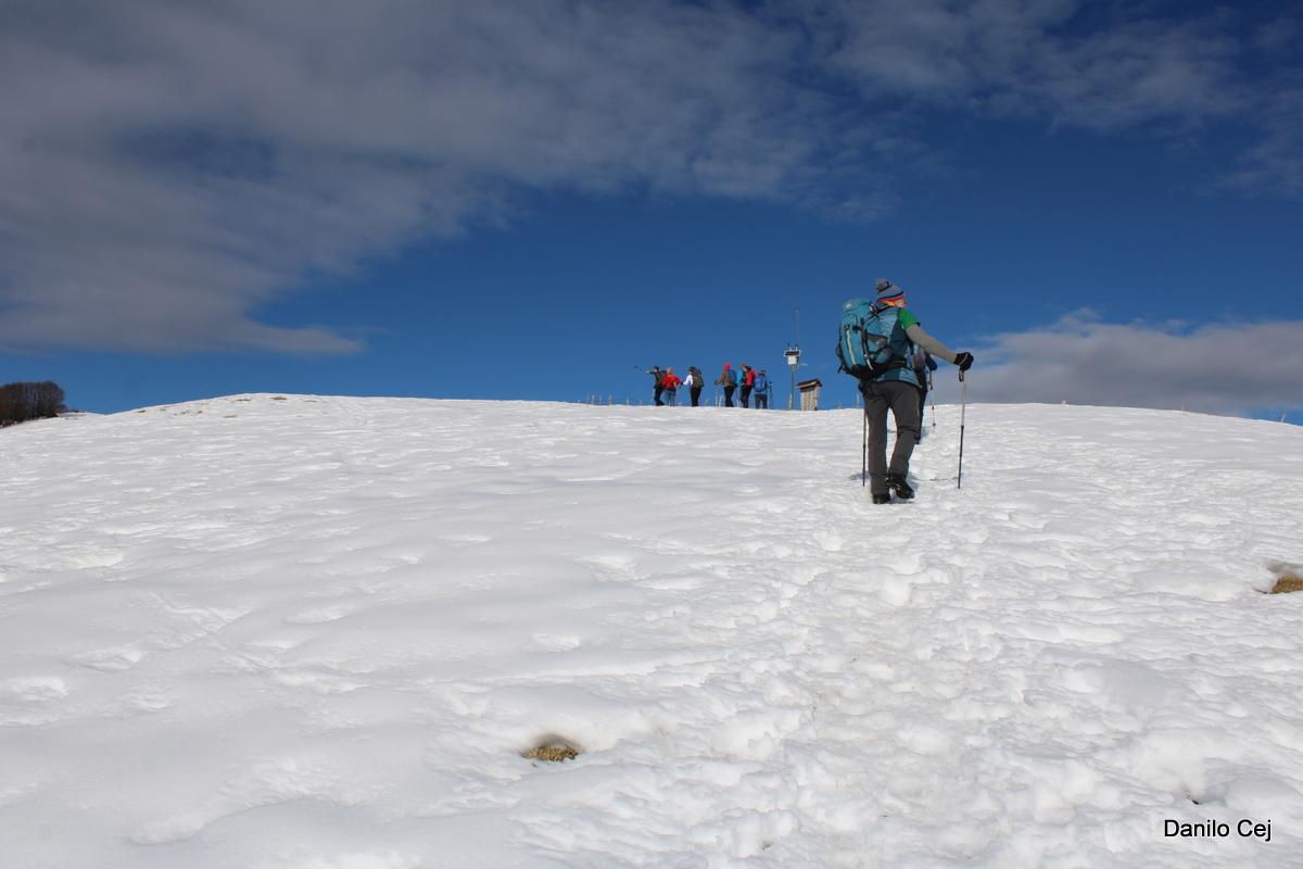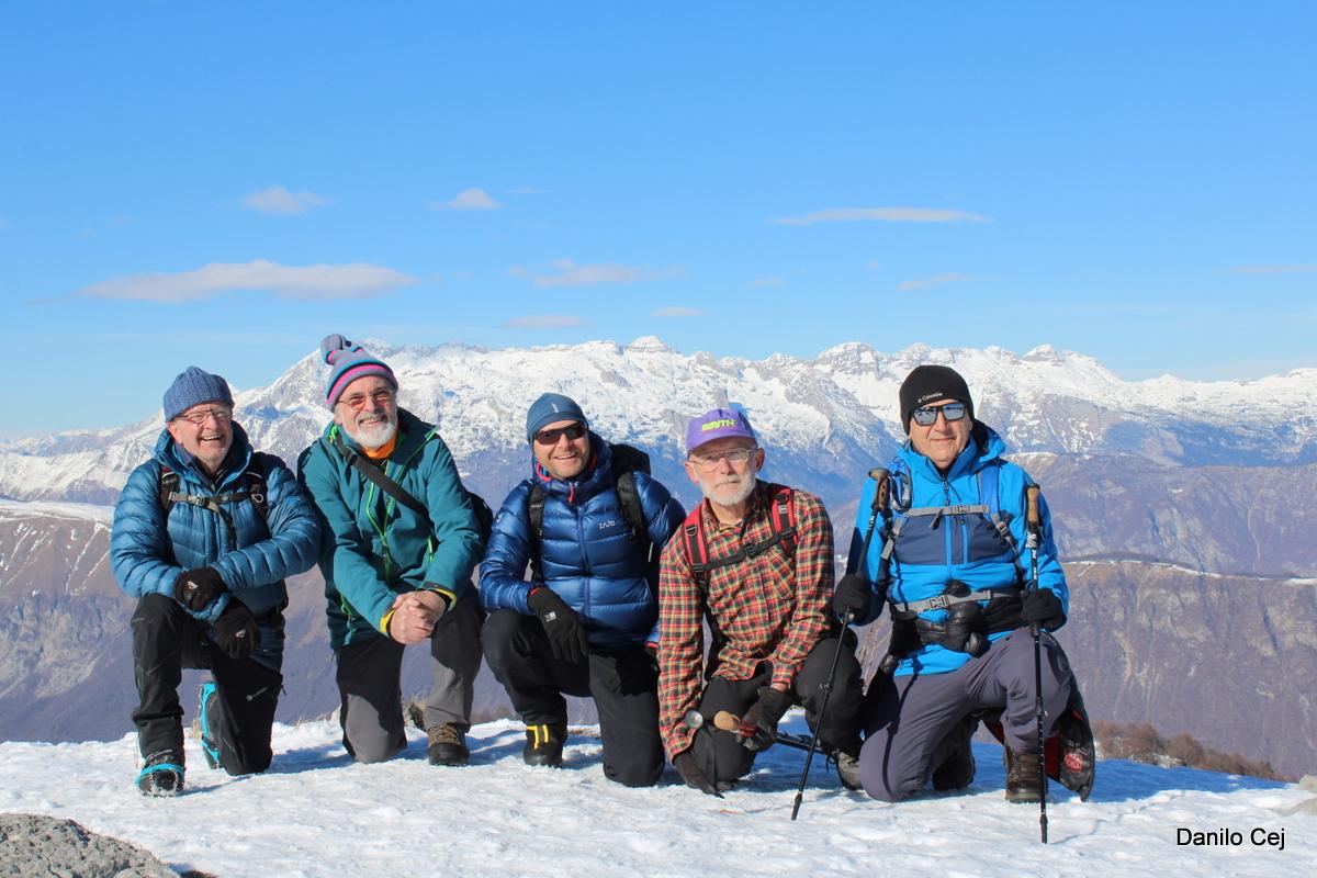 Proti vrhu smo se podali preko Starega vrha 1320m, kjer se nam že odprejo prelepi pogledi prosi zasneženim vrhovom vse tja do Kaninskega pogorja. Pot nadaljujemo preko Mrzlega vrha 1358m, kjer si privoščimo krajši postanek za žigosanje, slikanje in seveda razglede.