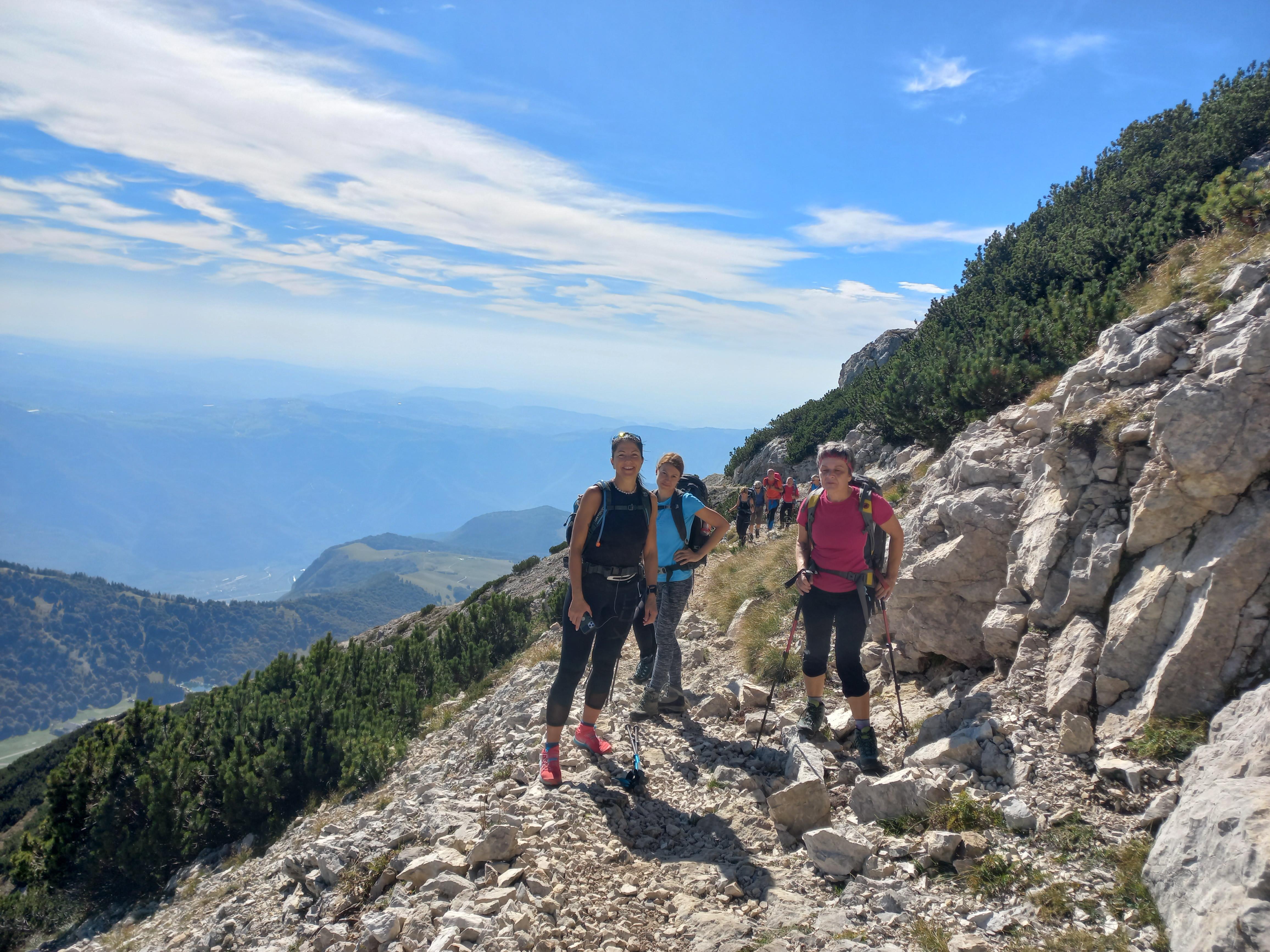 Imeli smo malo zamude, saj smo bili velika skupina in s hojo smo pričeli šele ob 9:30. Skupaj smo se pričeli vzpenjati na greben pogorja Monte Baldo, kjer smo razdelili: puščice so šle na Cima Valdritta 2218 m (najvišji vrh) i n od tod na Cima Telegrafo 2200 m, nato na ferrato dele Taccole in na vrh Vetta dele Buse 2154 m. Tisti, ki se niso povzpeli na ferato, so se s Cima Telegrafo spustili na izgodišče.