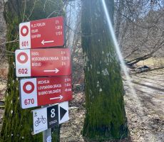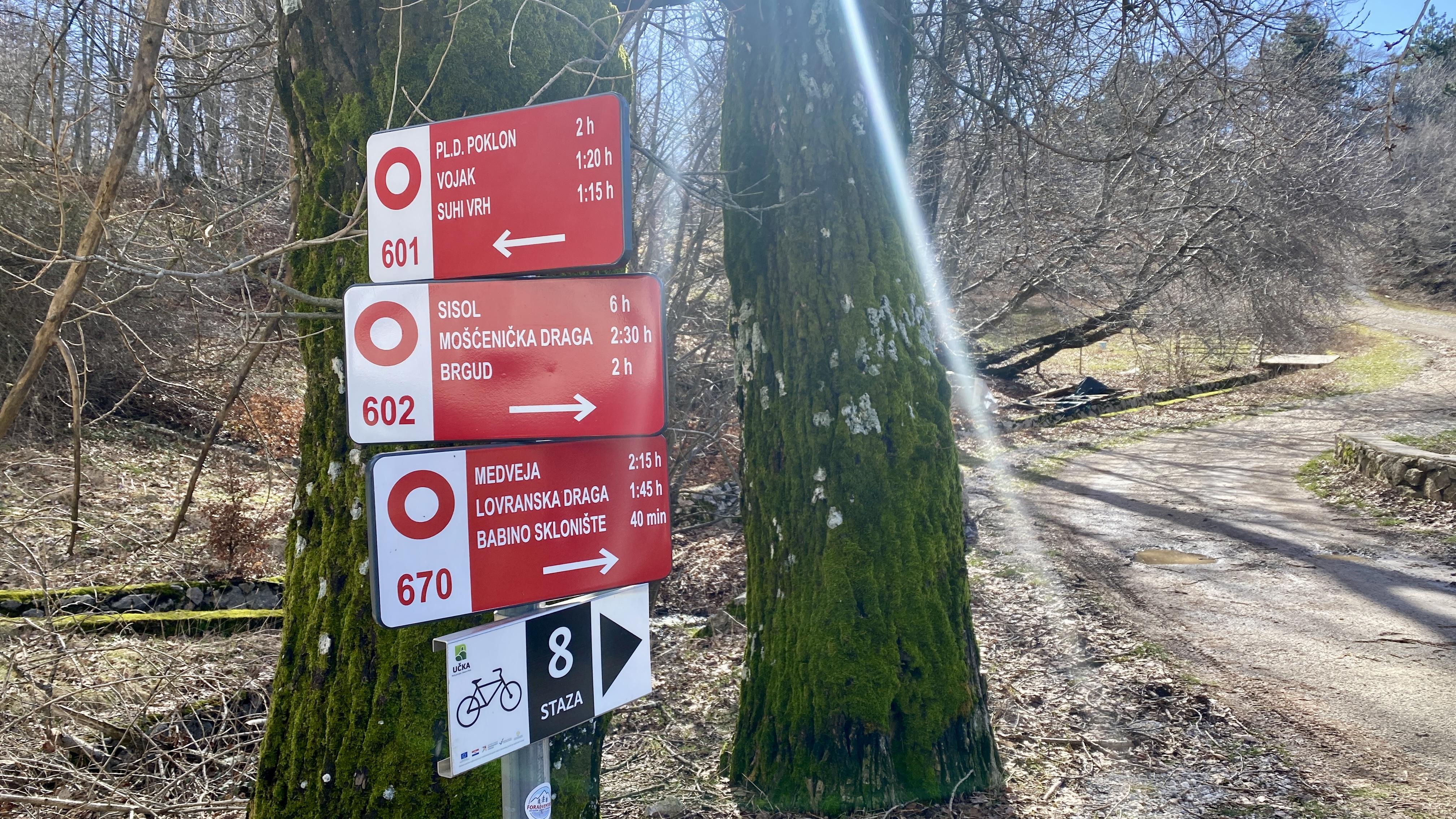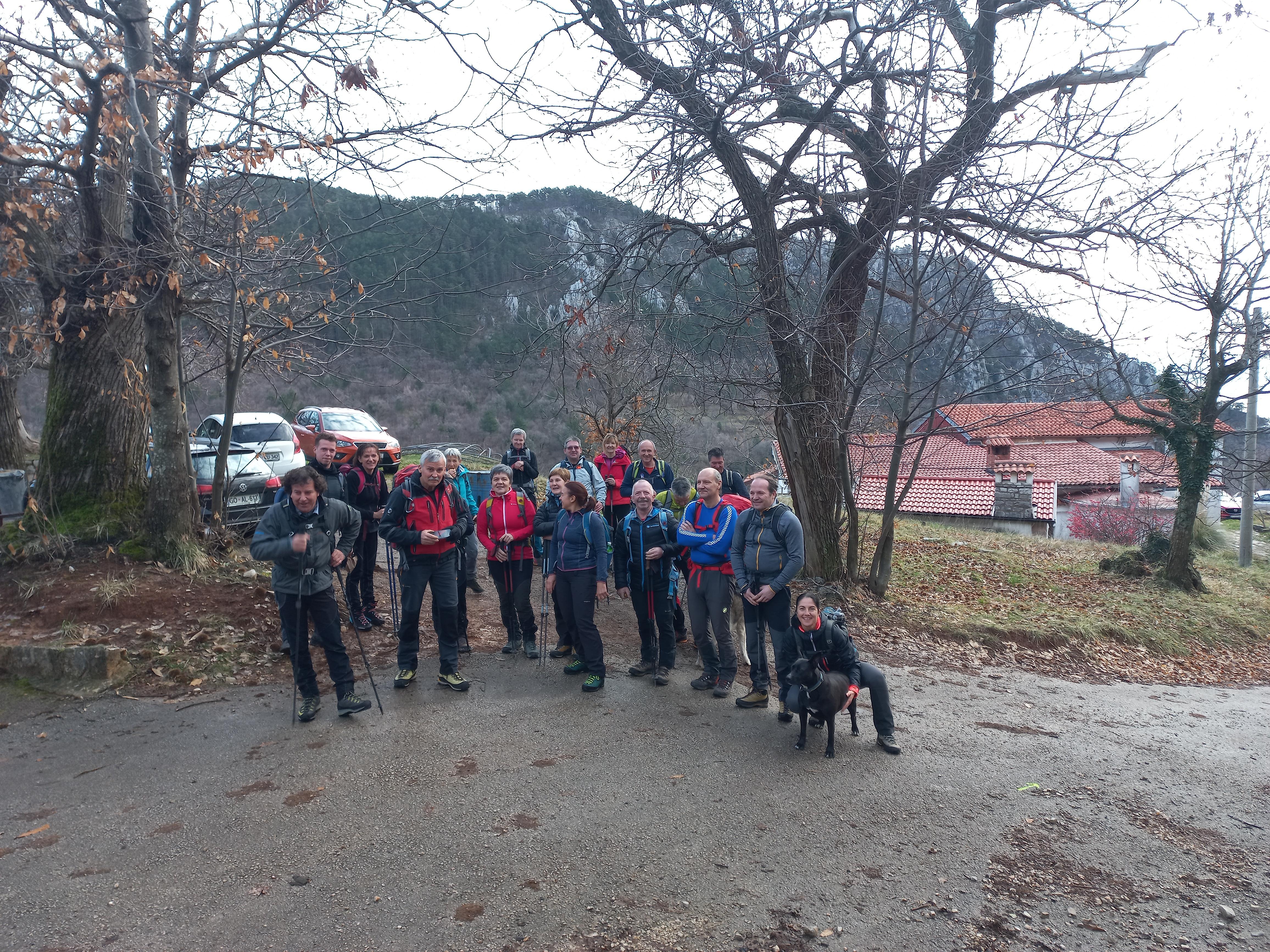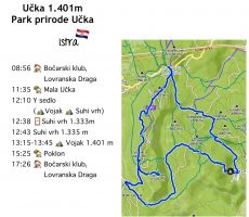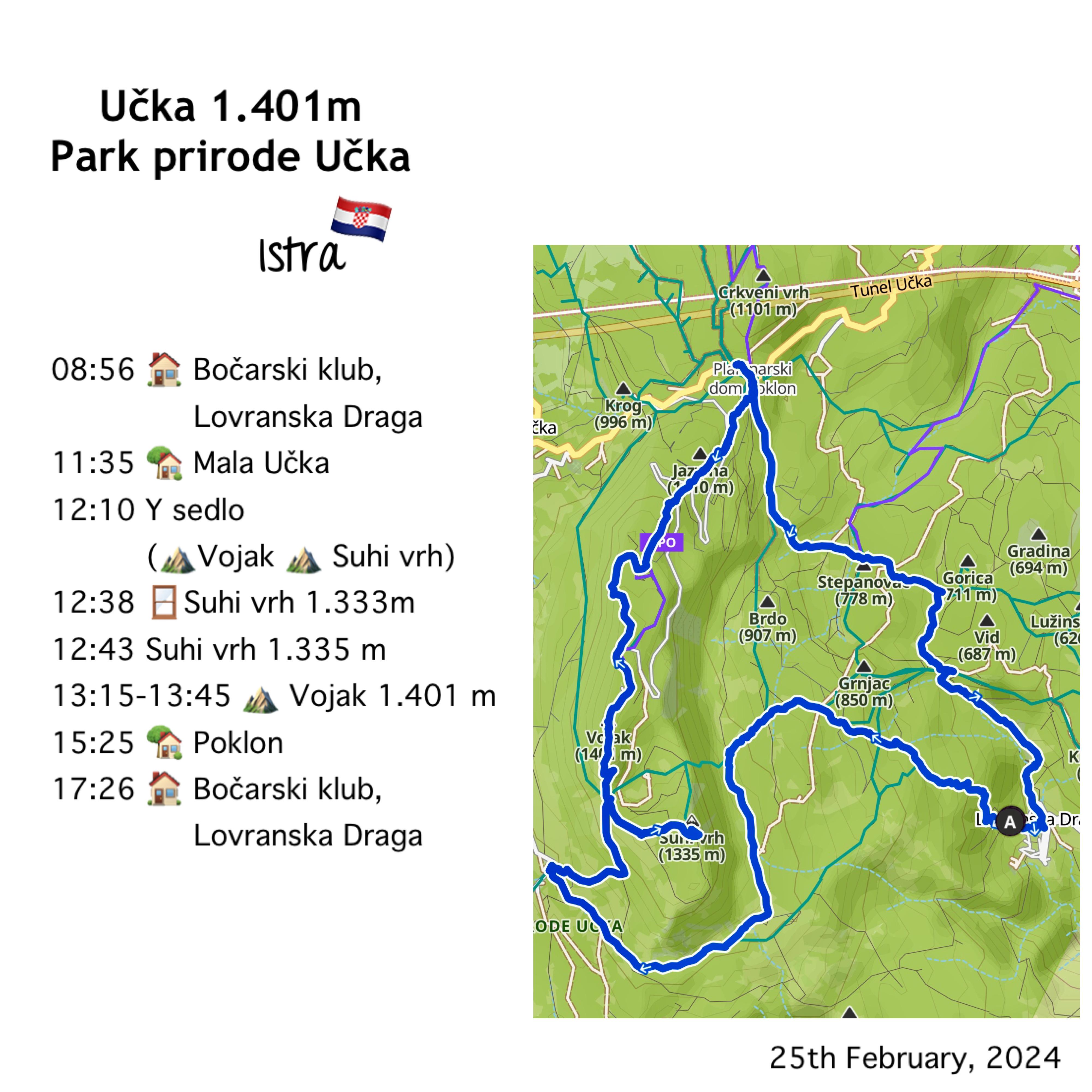 Zjutraj smo se porazdelili v 3 avte in se odpeljali do Kozine, kjer smo dobili še 2 posadki. Pot do Lovranske Drage je dolga, na koncu tudi strma, vendar smo varno pripeljali do izhodišča pri balinarskem klubu Lovranska Draga. Za dostop do obeh vrhov Vojak in Suhi vrh smo si zastavili dolgo krožno pot preko vasice Male Učke in nato na Sedlo 1270 m, od koder so nekateri krenili kar na Vojak, drugi pa na oba vrhova. Na vrhu Vojak-a smo se vsi zbrali in pomalicali. Sledil je spust do Poklona, kjer je tudi koča (vendar sam kraj nima ničesar zanimivega) in se nato po makadamu in po blatni gozdni poti spustili do našega izhodišče, kjer smo imeli malico (hvala Mojjci , Božotu in Trampužu). |